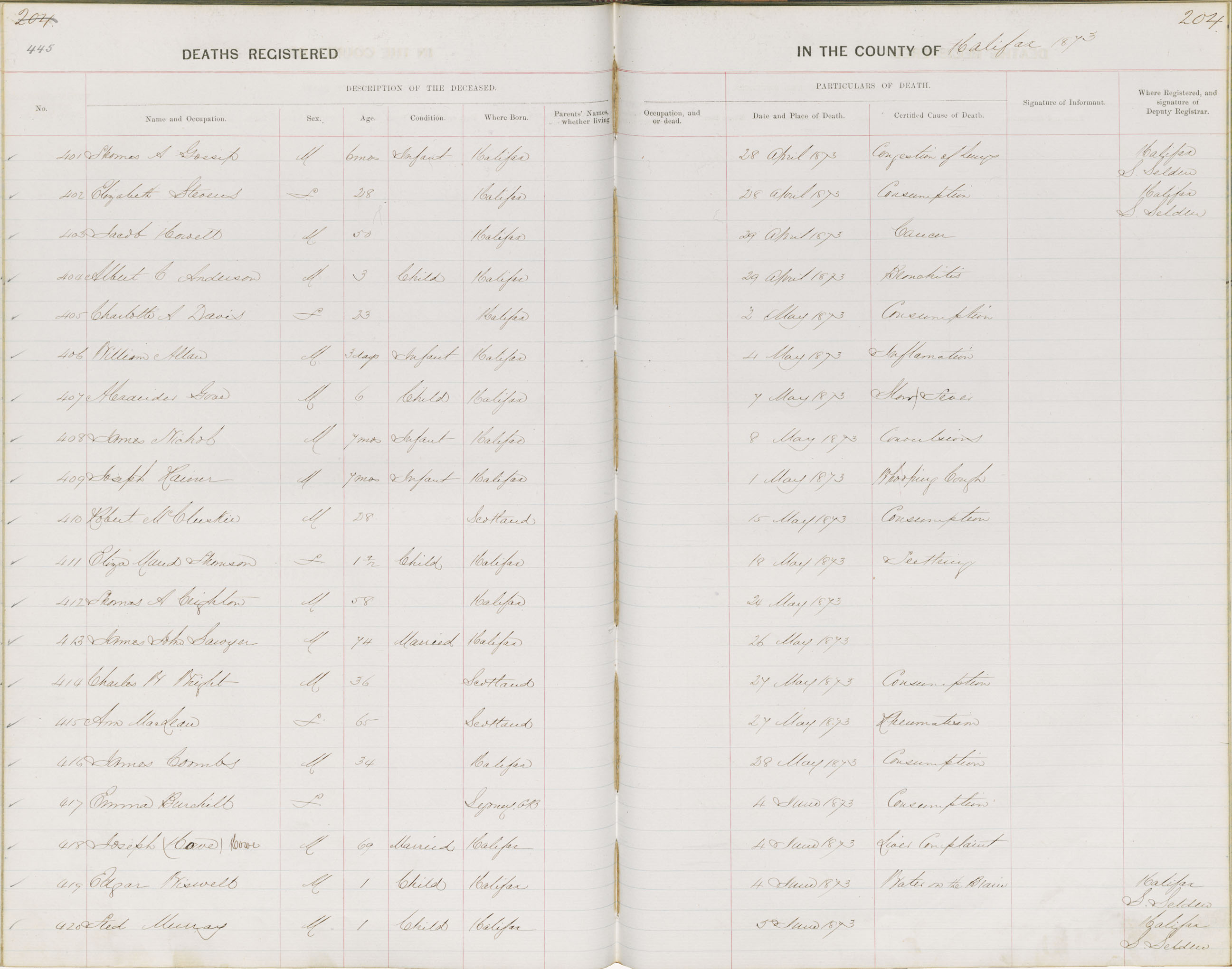 Death Registration: Year: 1873 book: 1808 page: 445 number: 420