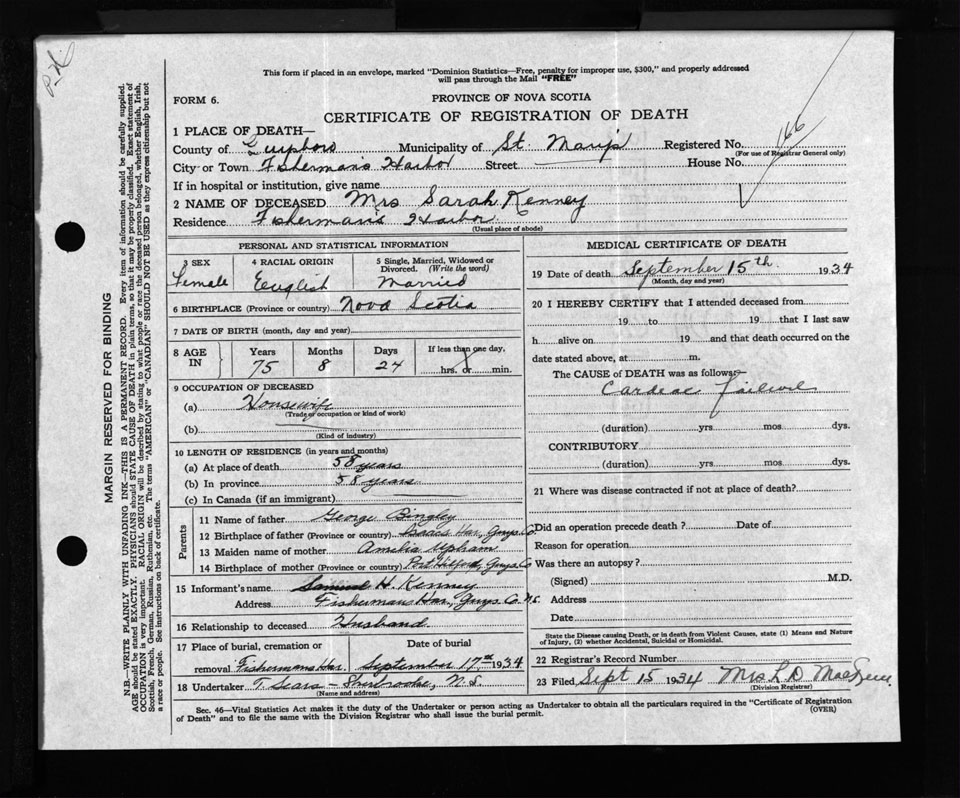 Female Death Registration: Year: 1934 file: 145 number: 166