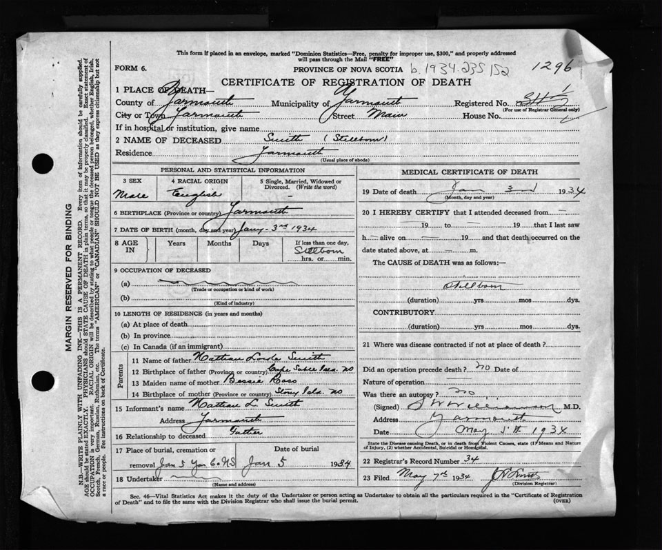 Male Death Registration: Year: 1934 file: 156 number: 1296