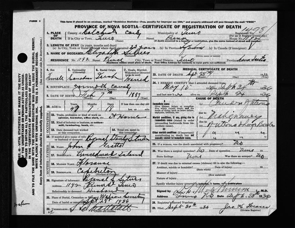 Female Death Registration: Year: 1936 file: 157 number: 1498