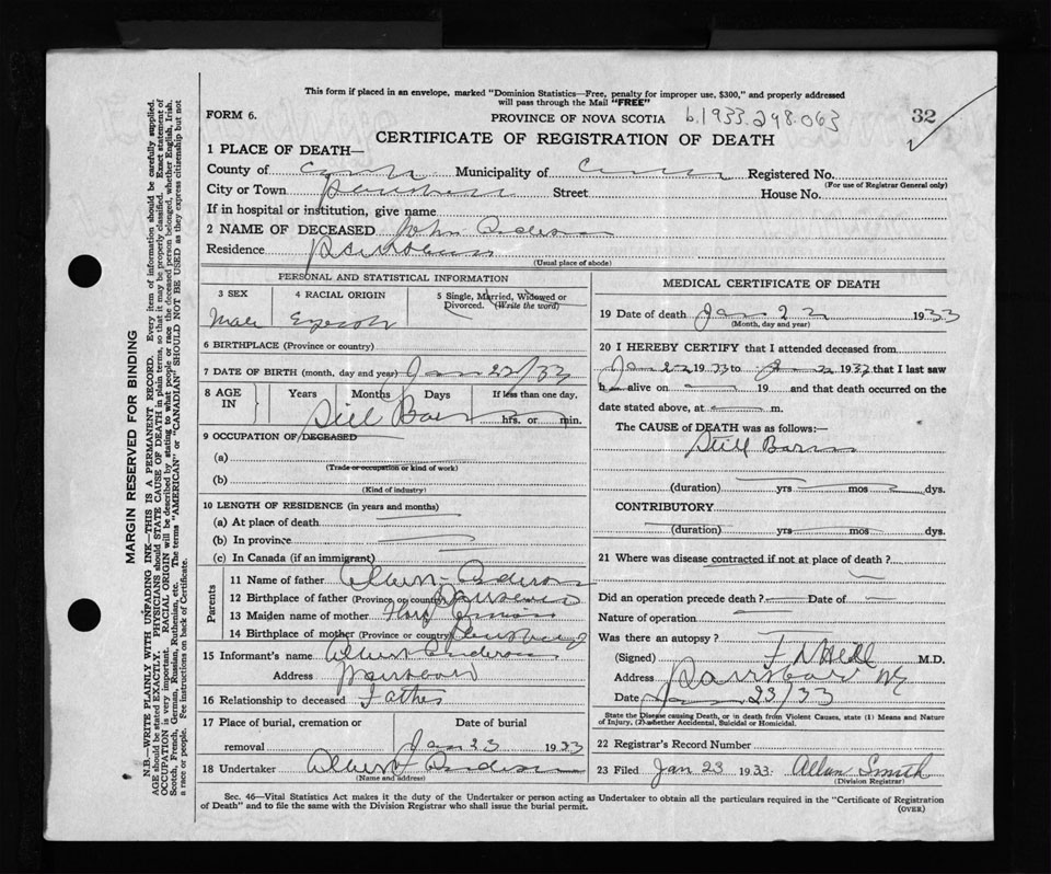 Male Death Registration: Year: 1933 file: 159 number: 32