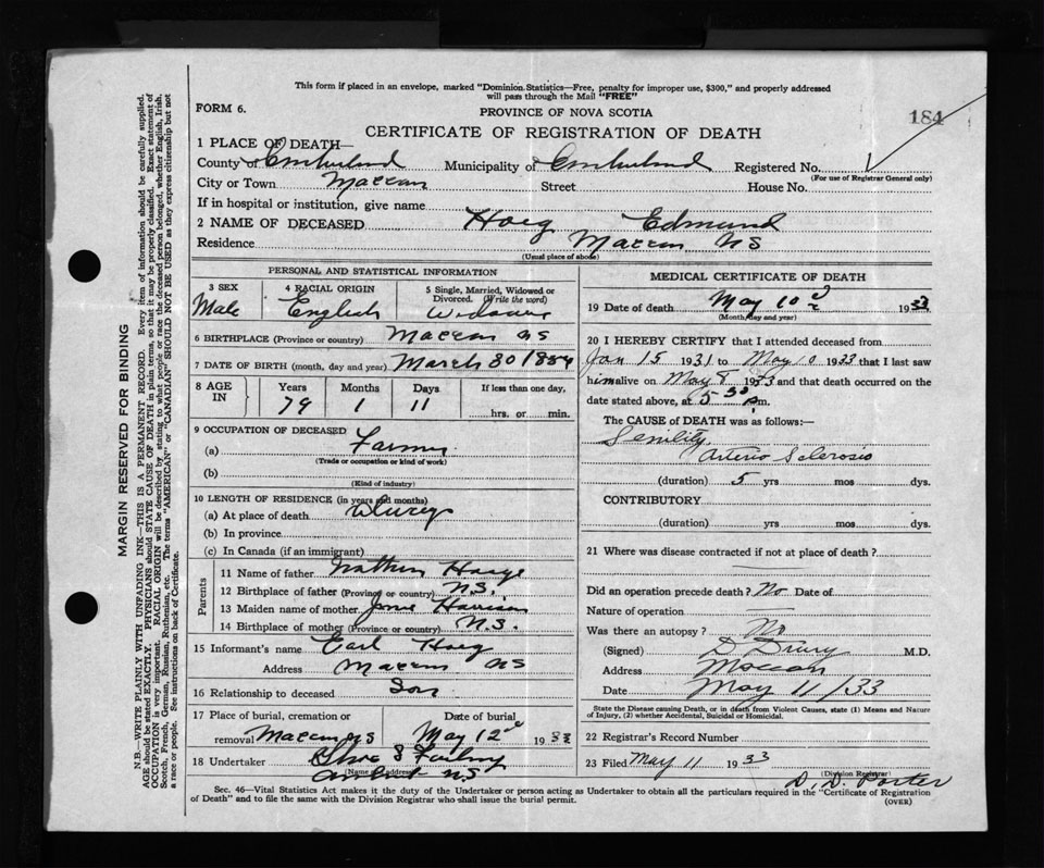 Male Death Registration: Year: 1933 file: 159 number: 184