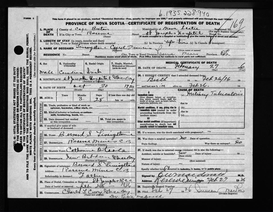 Male Death Registration: Year: 1936 file: 165 number: 169