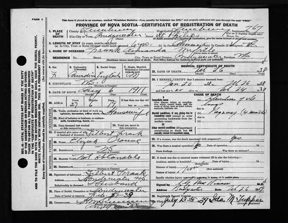Female Death Registration: Year: 1938 file: 174 number: 767