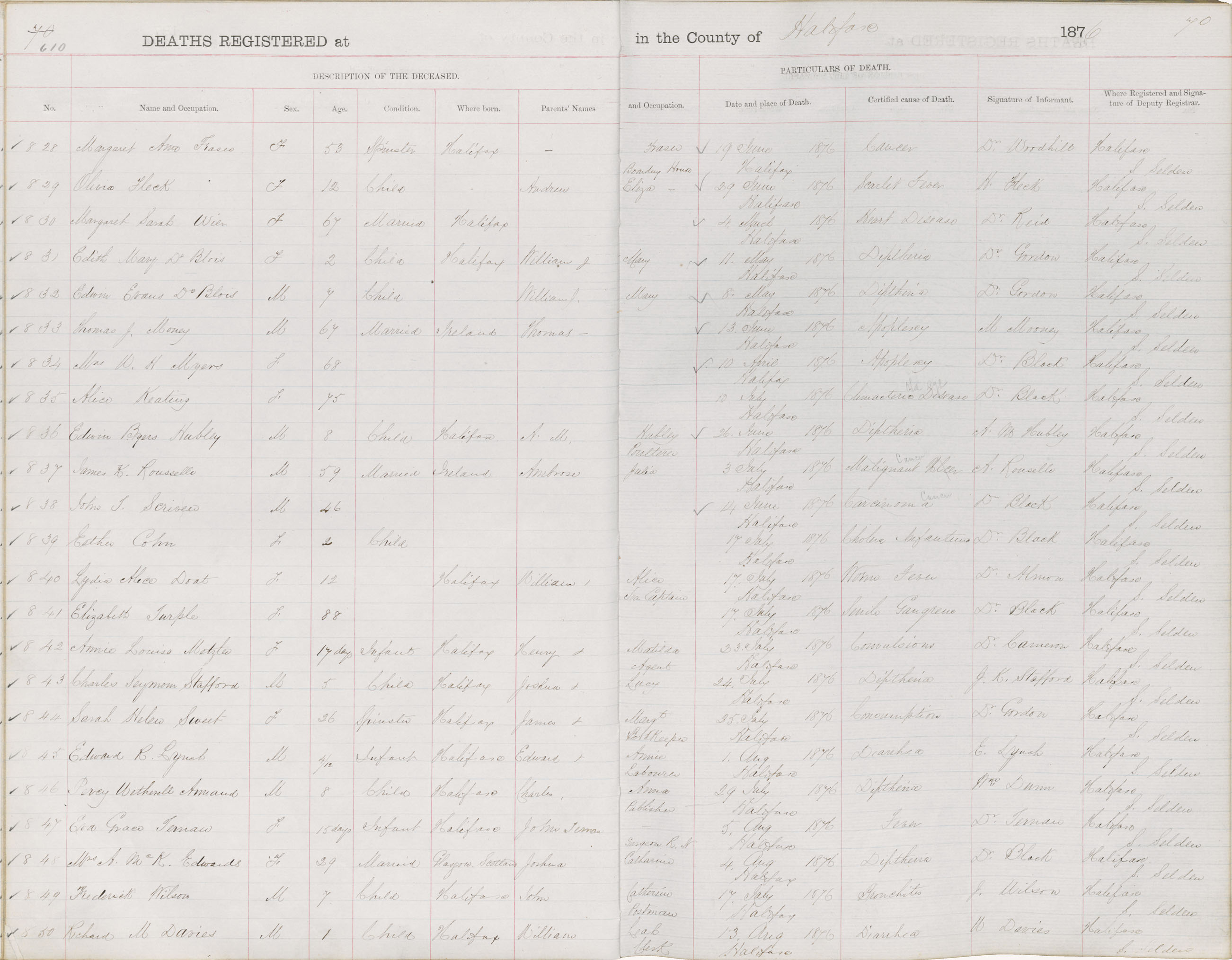 Death Registration: Year: 1876 book: 1808 page: 610 number: 850
