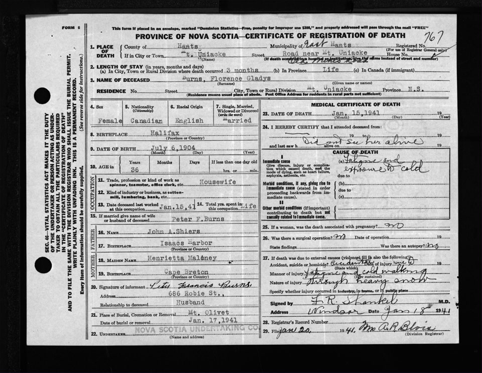 Female Death Registration: Year: 1941 file: 179 number: 767
