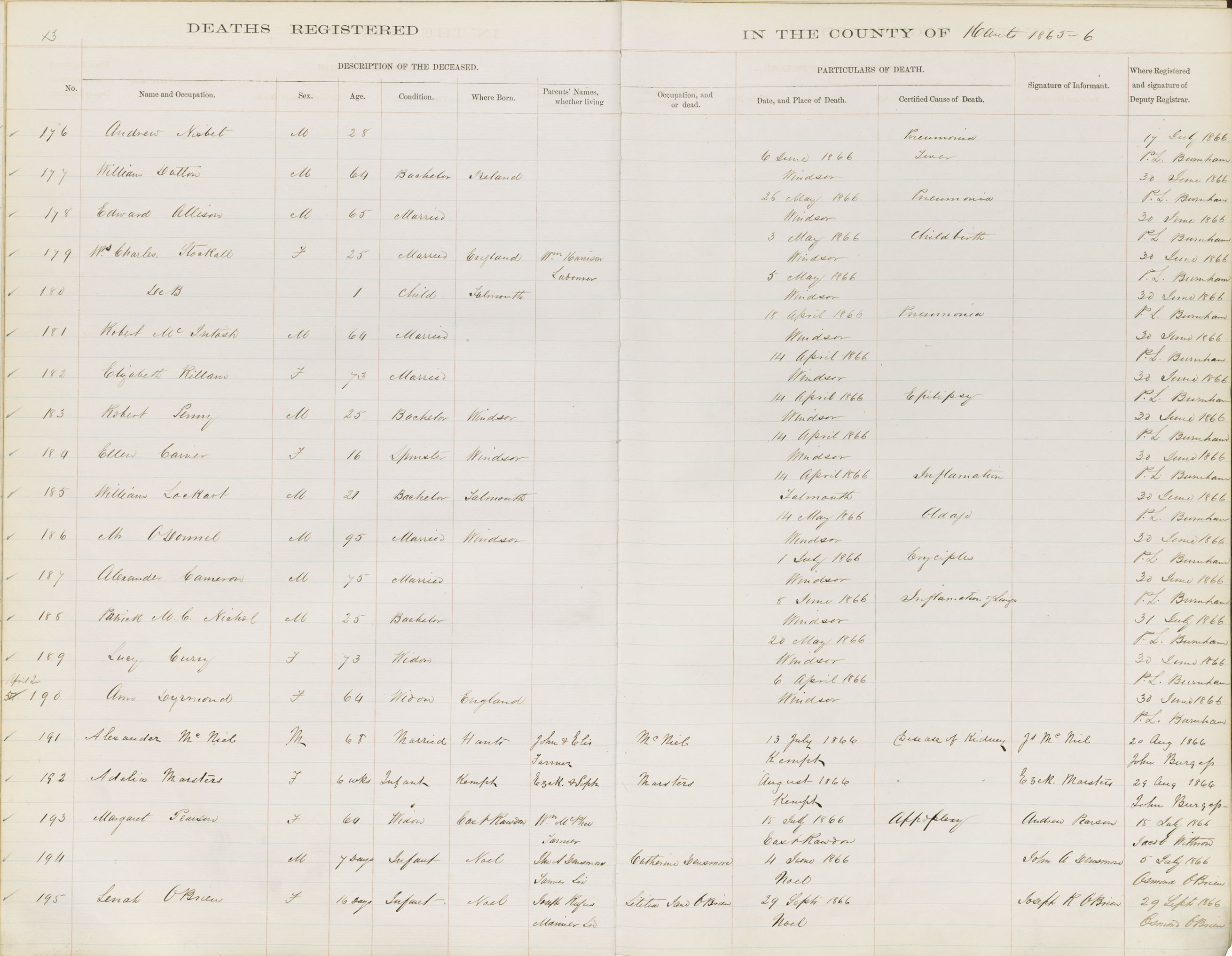 Male Death Registration: Year: 1866 book: 1809 page: 13 number: 176