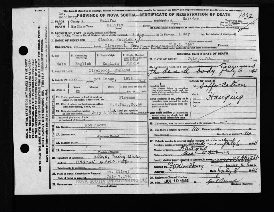 Male Death Registration: Year: 1941 file: 197 number: 1032