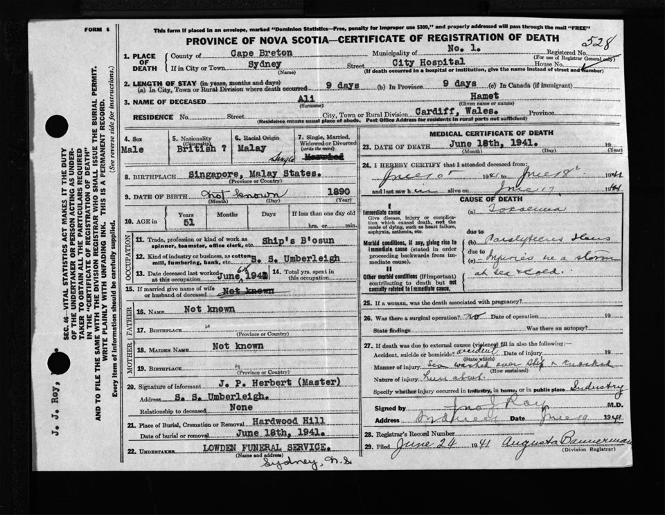 Male Death Registration: Year: 1941 file: 198 number: 528