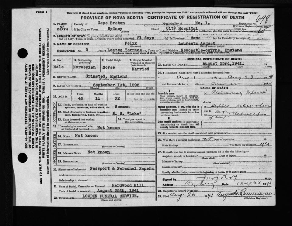 Male Death Registration: Year: 1941 file: 198 number: 698