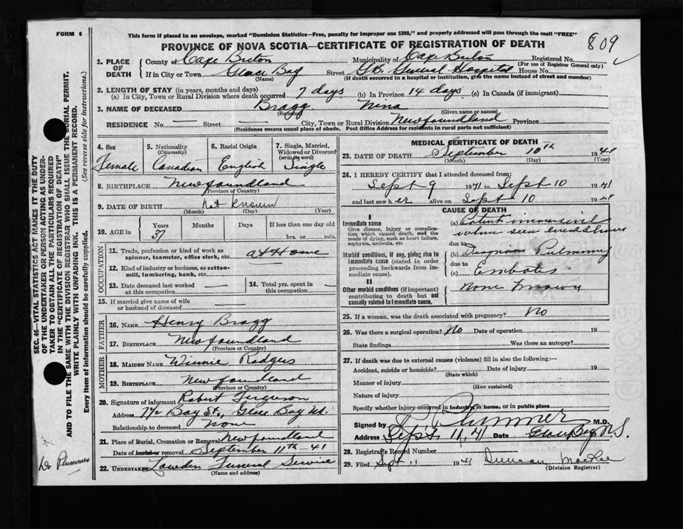 Female Death Registration: Year: 1941 file: 198 number: 809