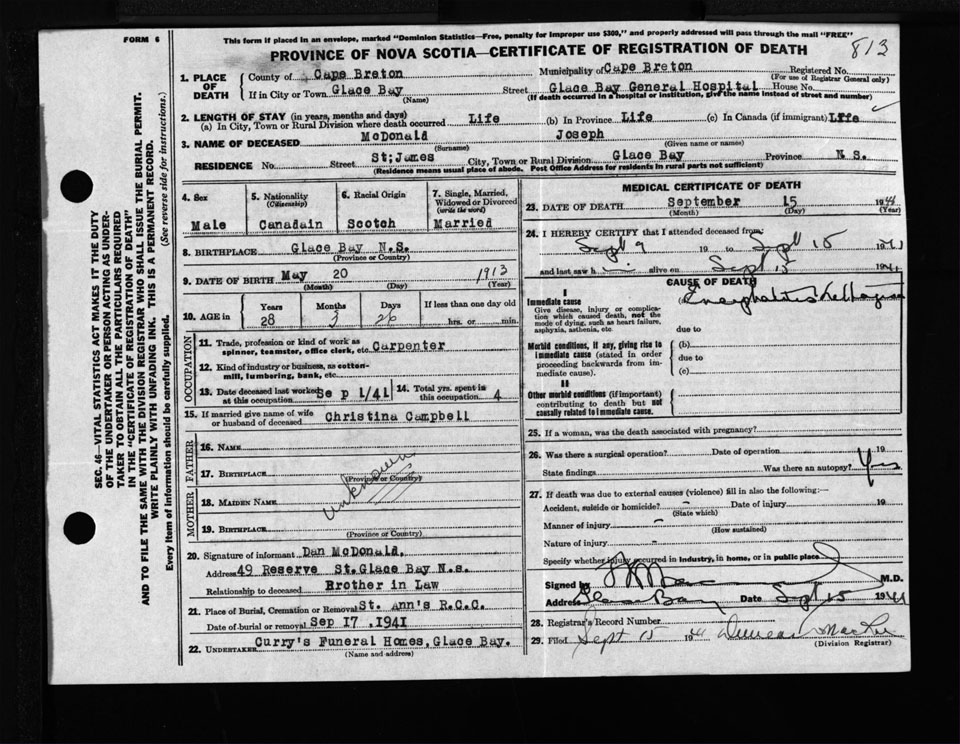 Male Death Registration: Year: 1941 file: 198 number: 813