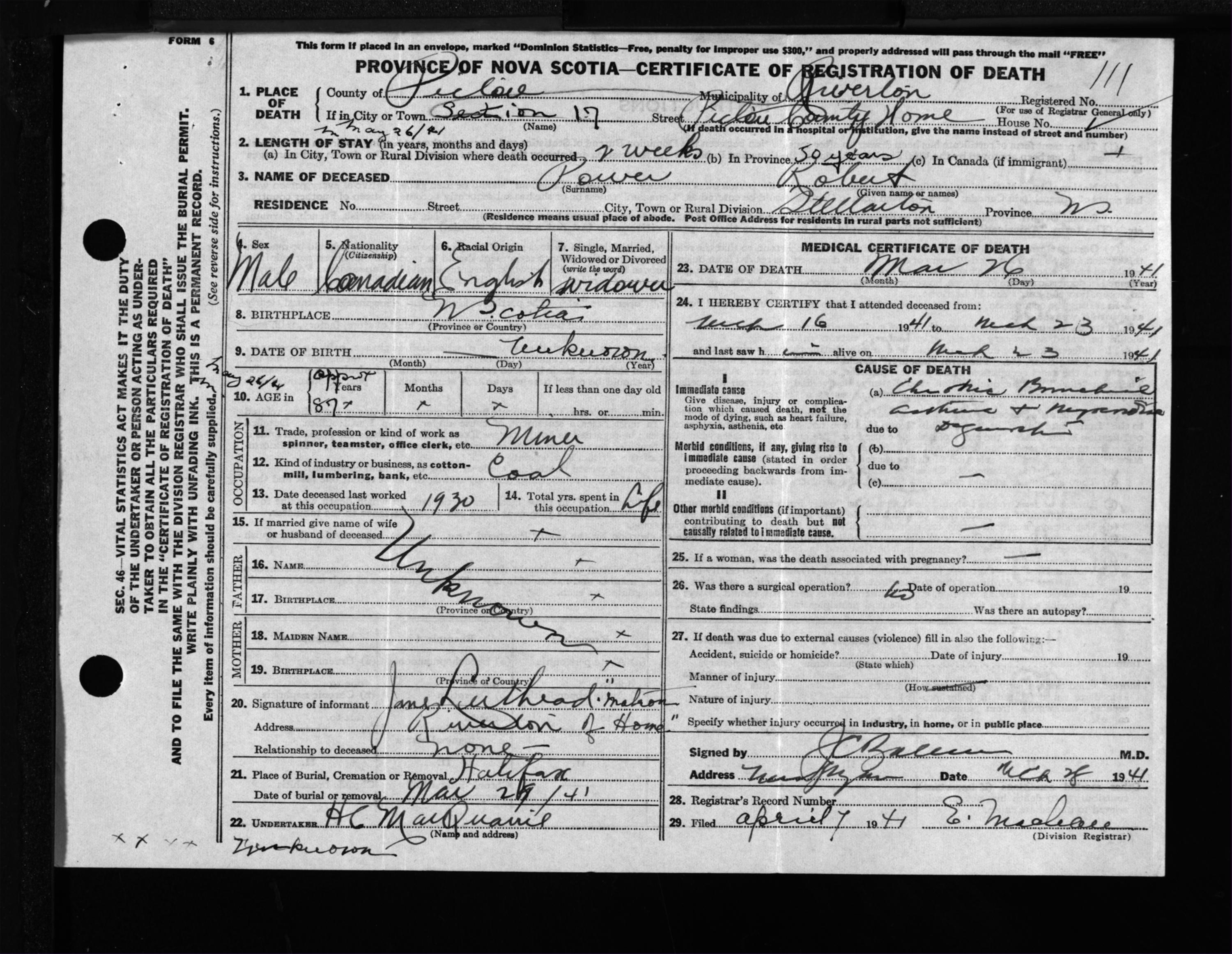 Male Death Registration: Year: 1941 file: 200 number: 111