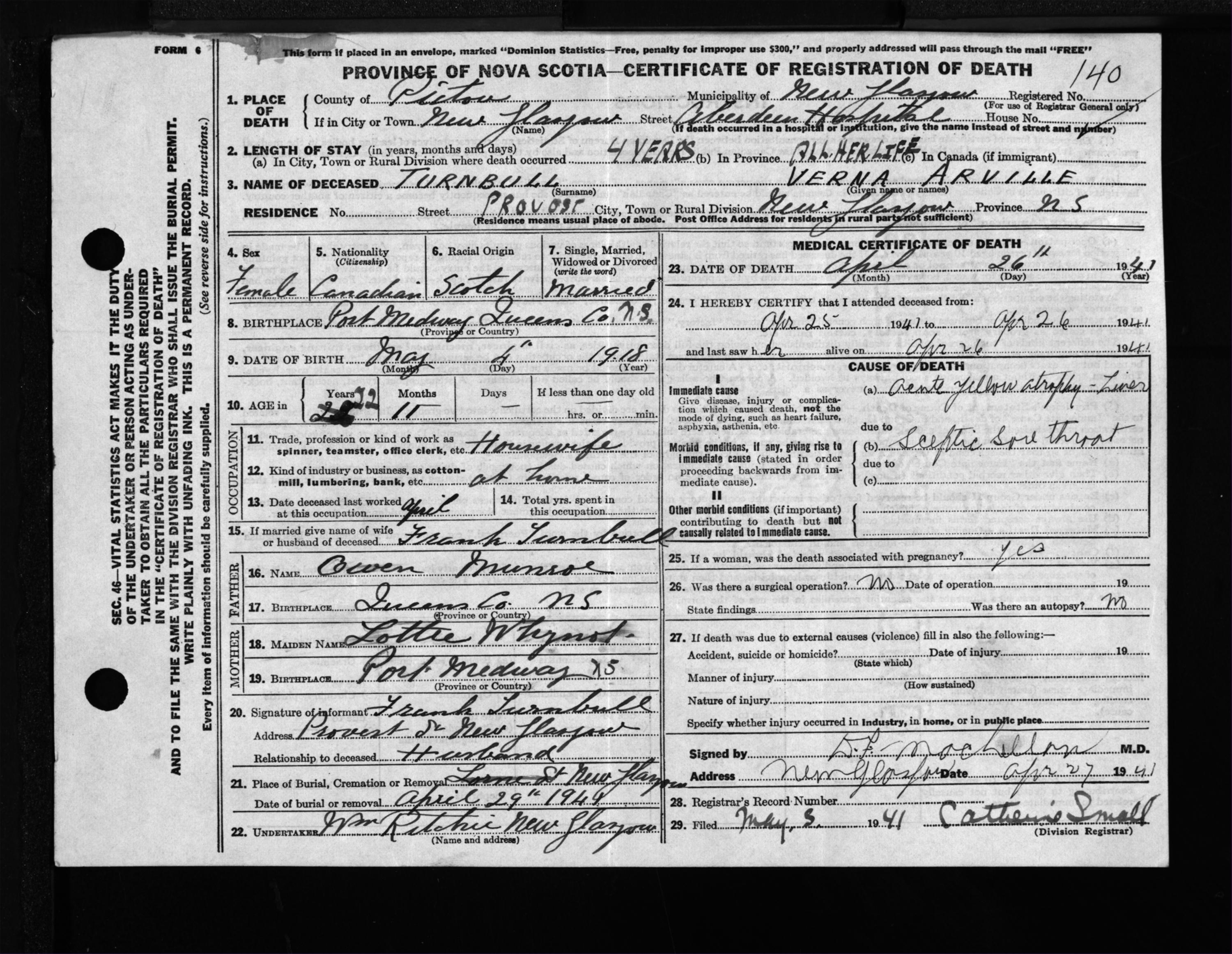 Female Death Registration: Year: 1941 file: 200 number: 140