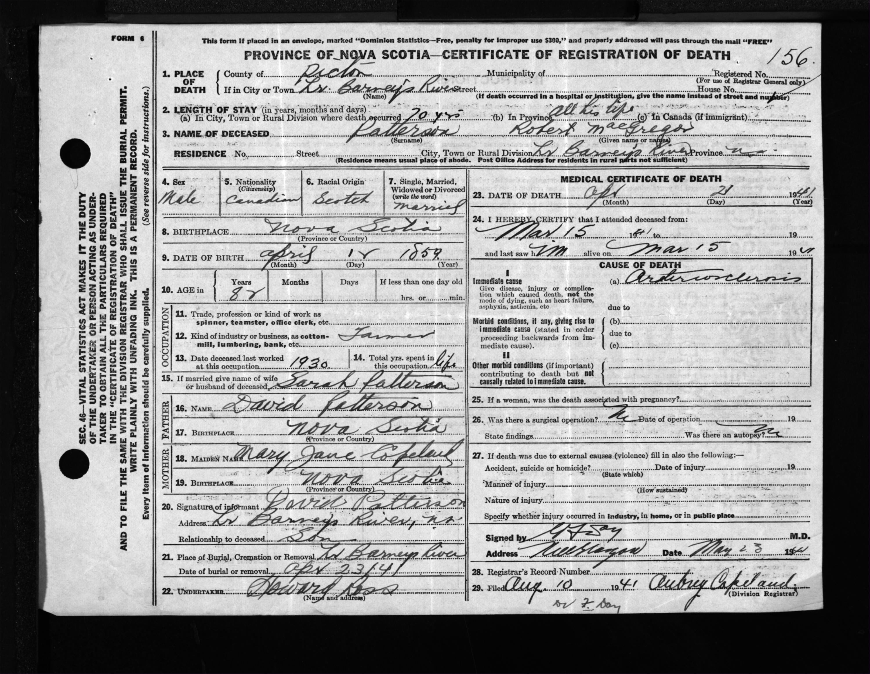 Male Death Registration: Year: 1941 file: 200 number: 156
