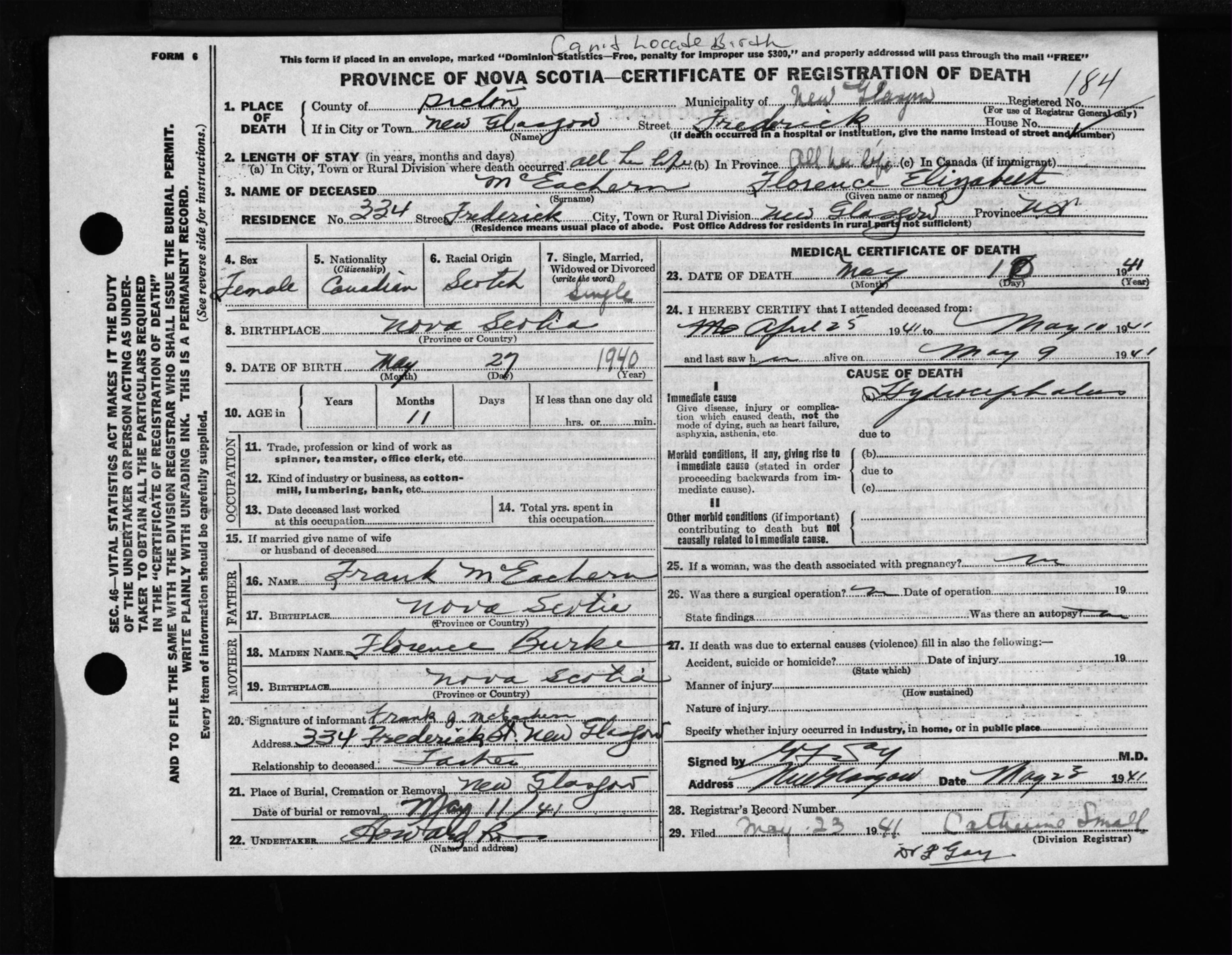 Female Death Registration: Year: 1941 file: 200 number: 184