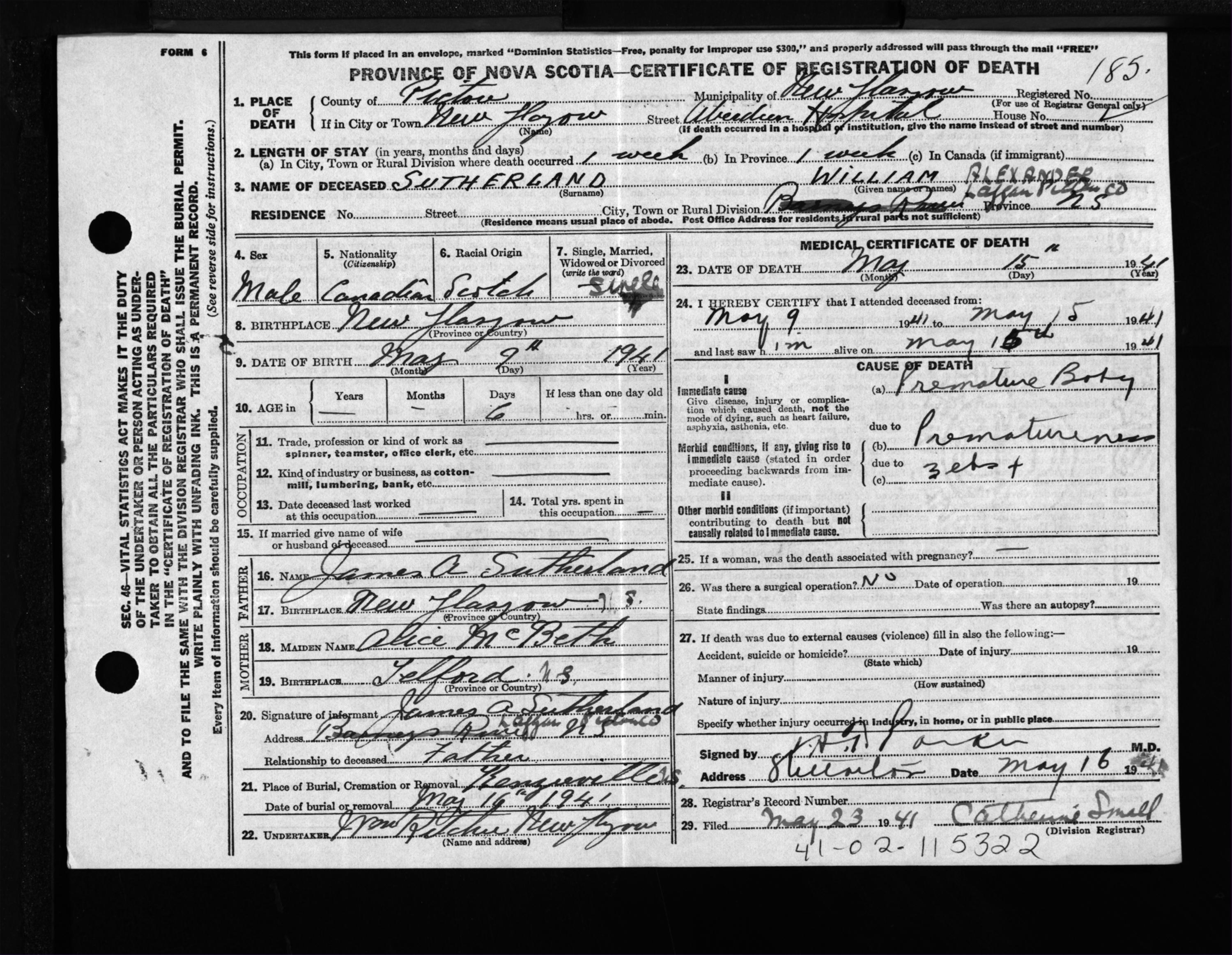 Male Death Registration: Year: 1941 file: 200 number: 185