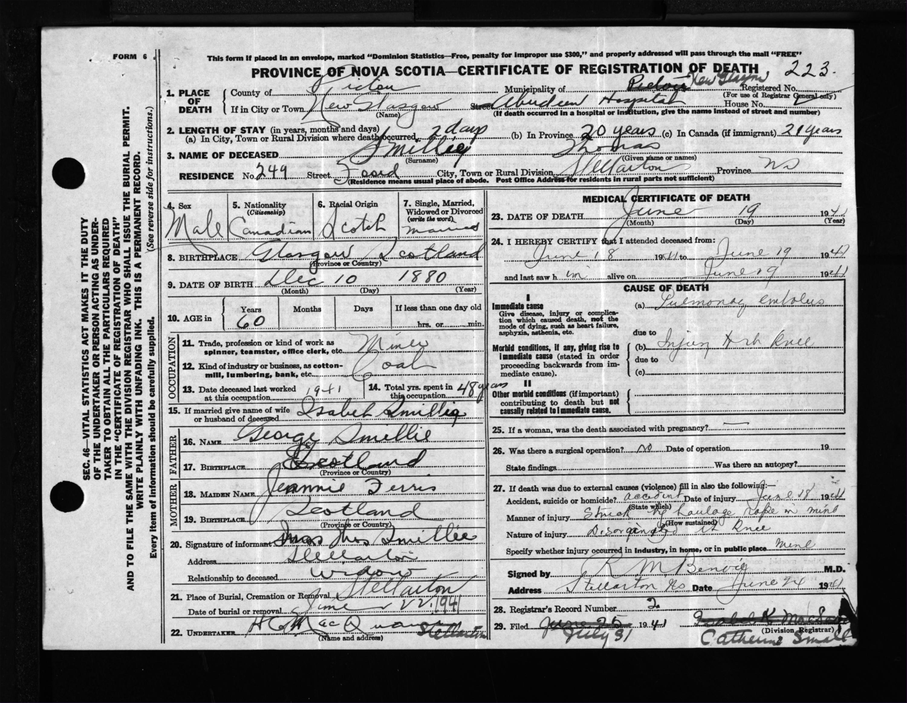 Male Death Registration: Year: 1941 file: 200 number: 223