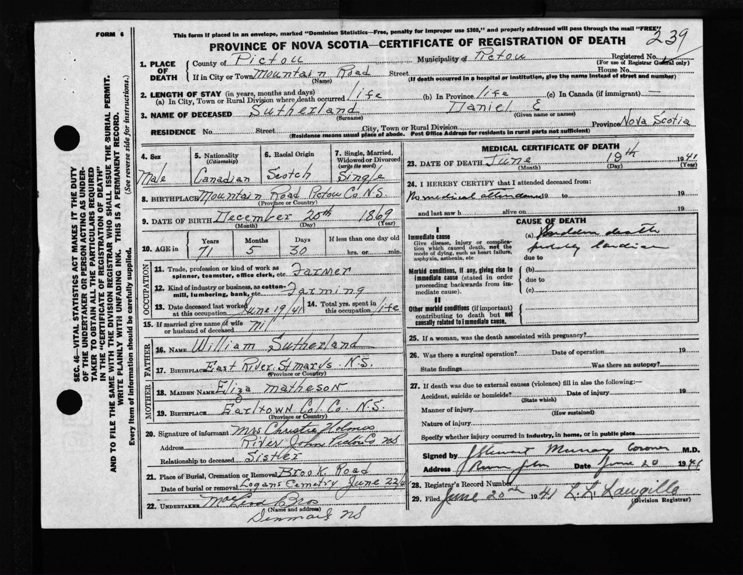 Male Death Registration: Year: 1941 file: 200 number: 239