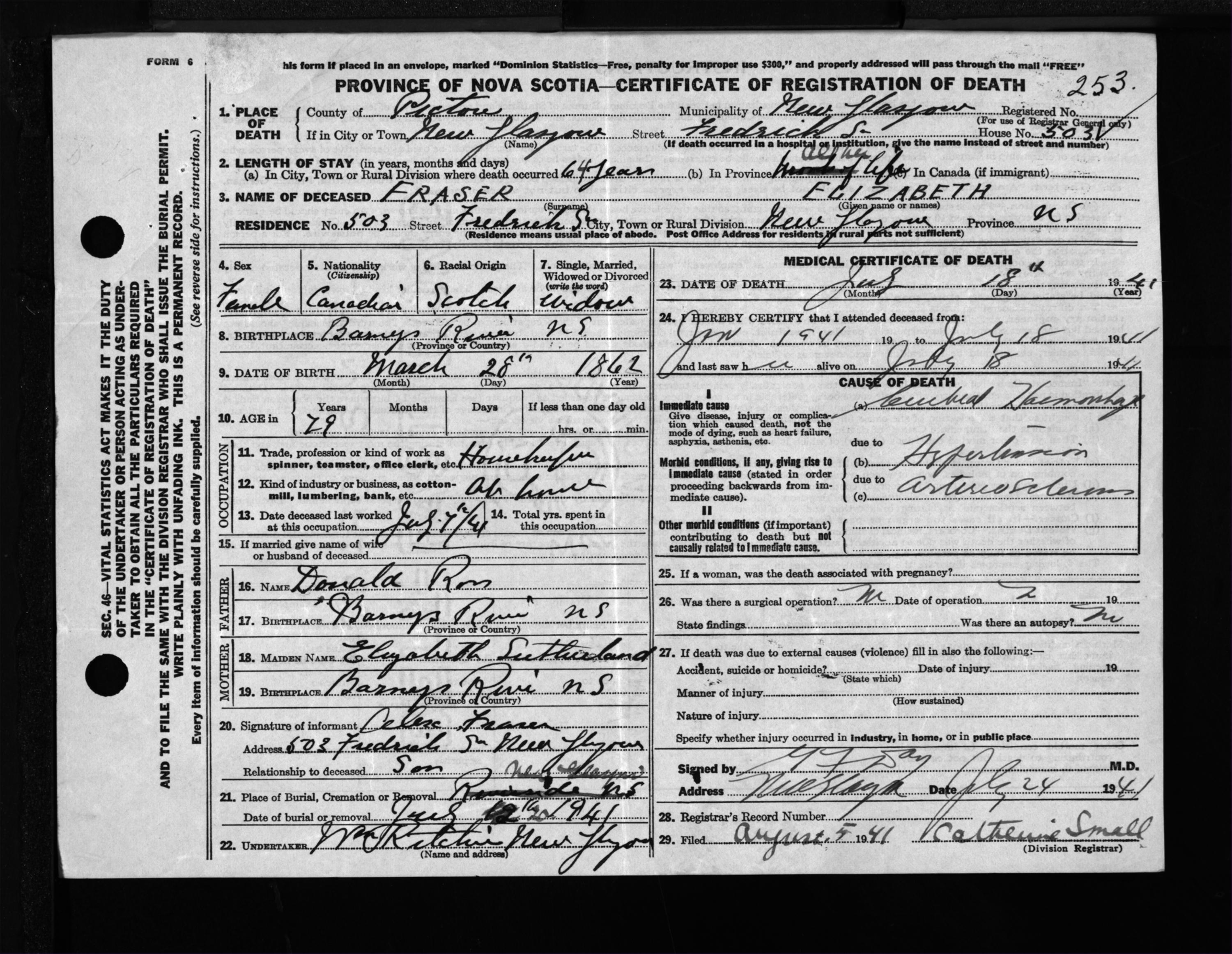 Female Death Registration: Year: 1941 file: 200 number: 253