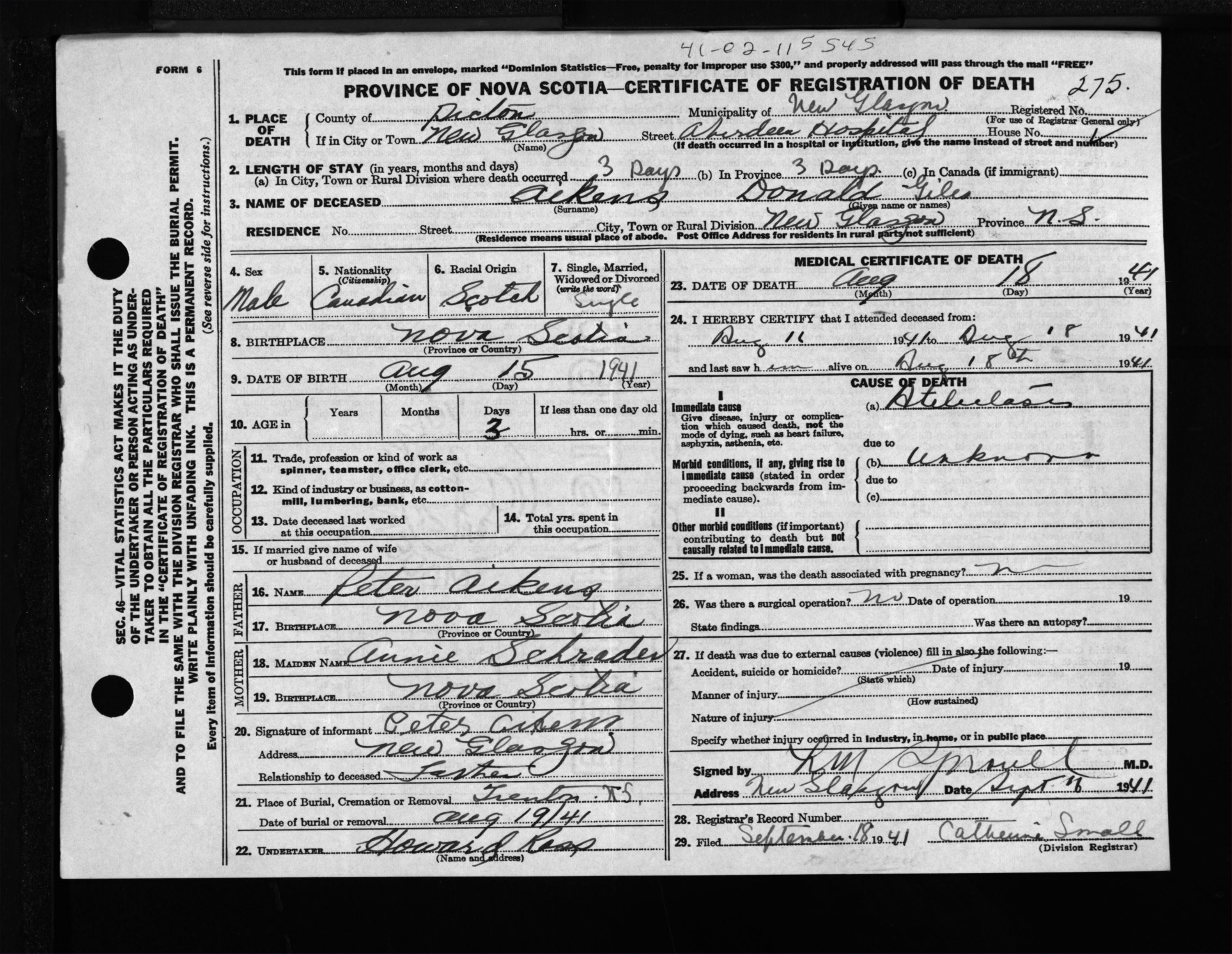 Male Death Registration: Year: 1941 file: 200 number: 275