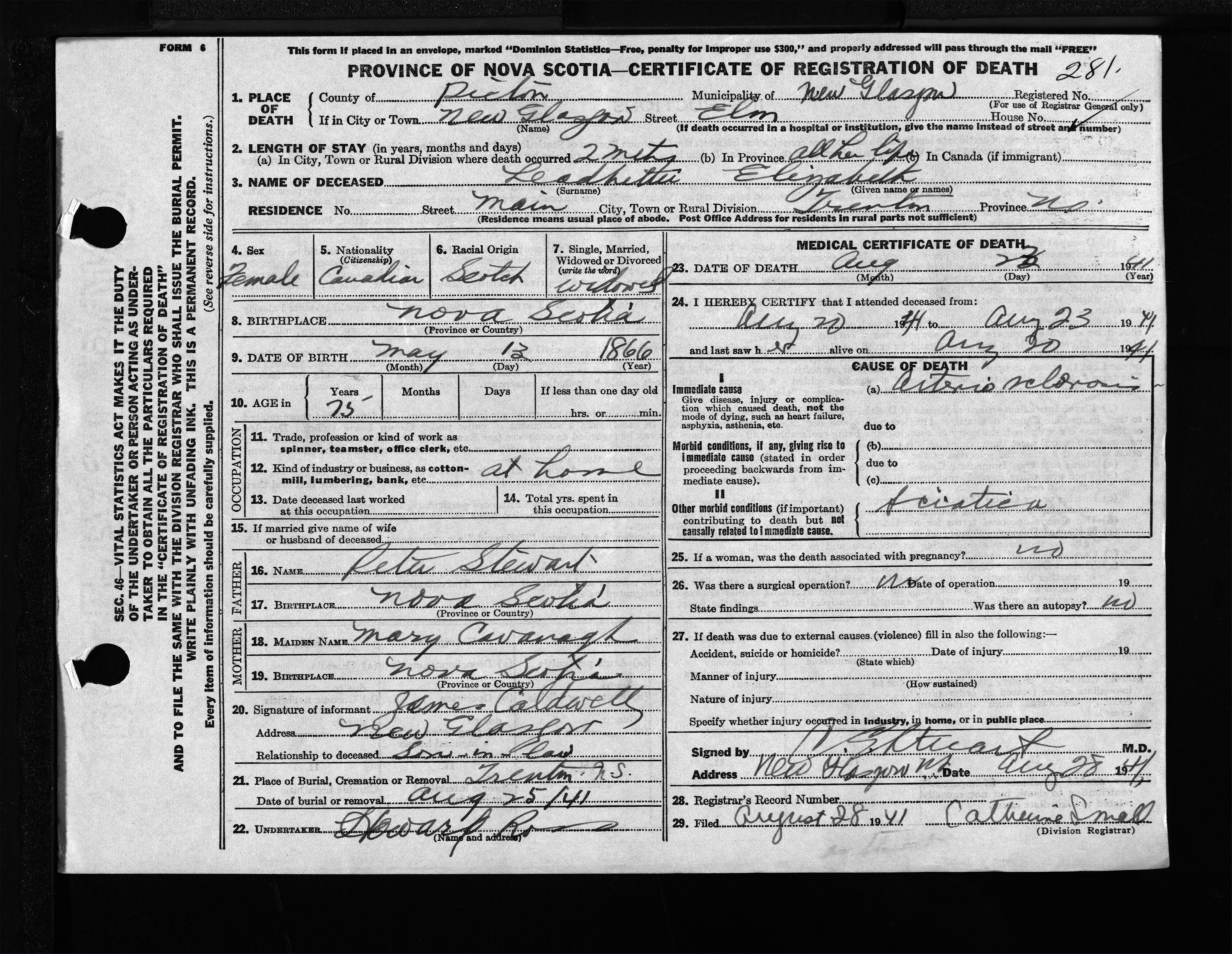 Female Death Registration: Year: 1941 file: 200 number: 281