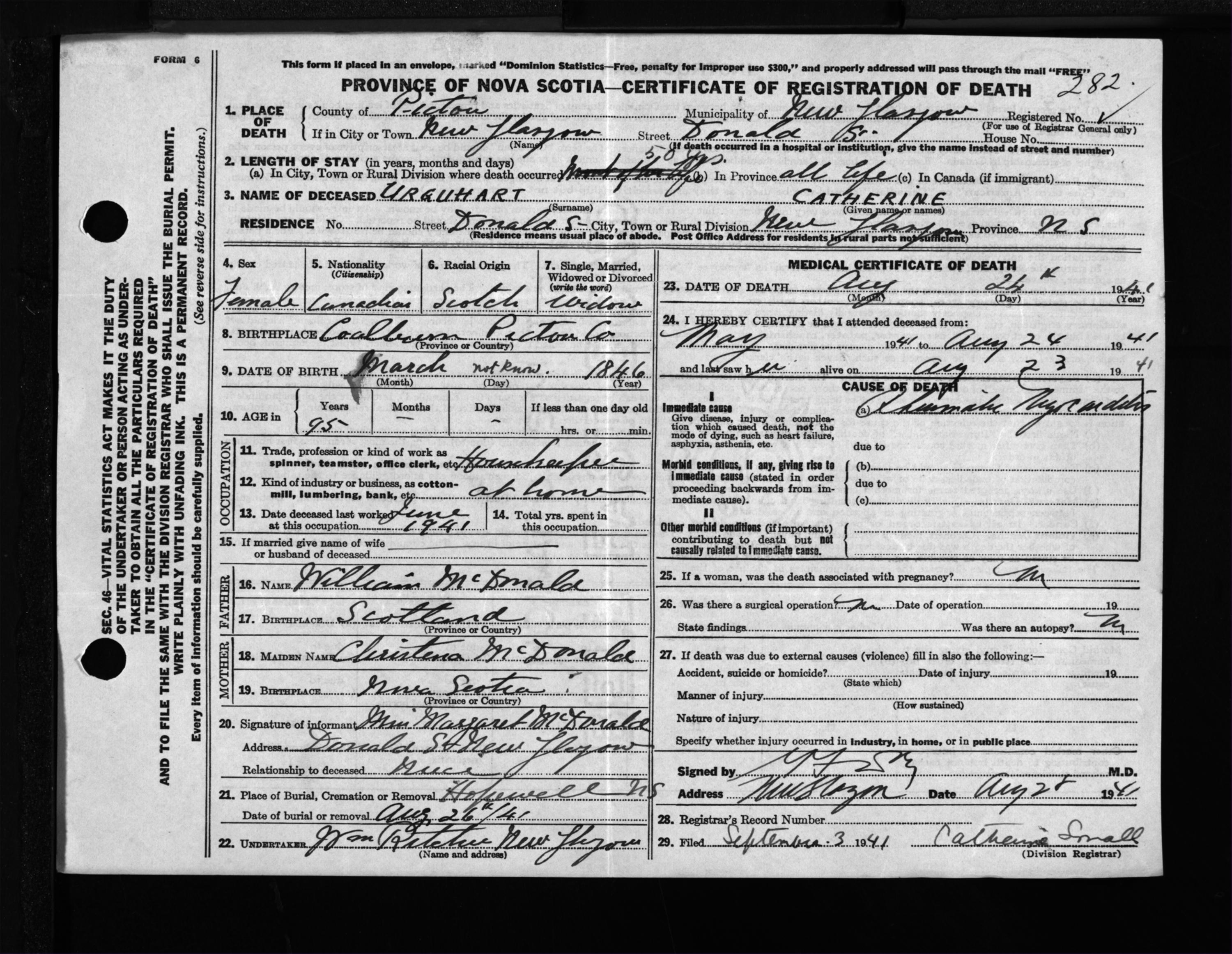 Female Death Registration: Year: 1941 file: 200 number: 282