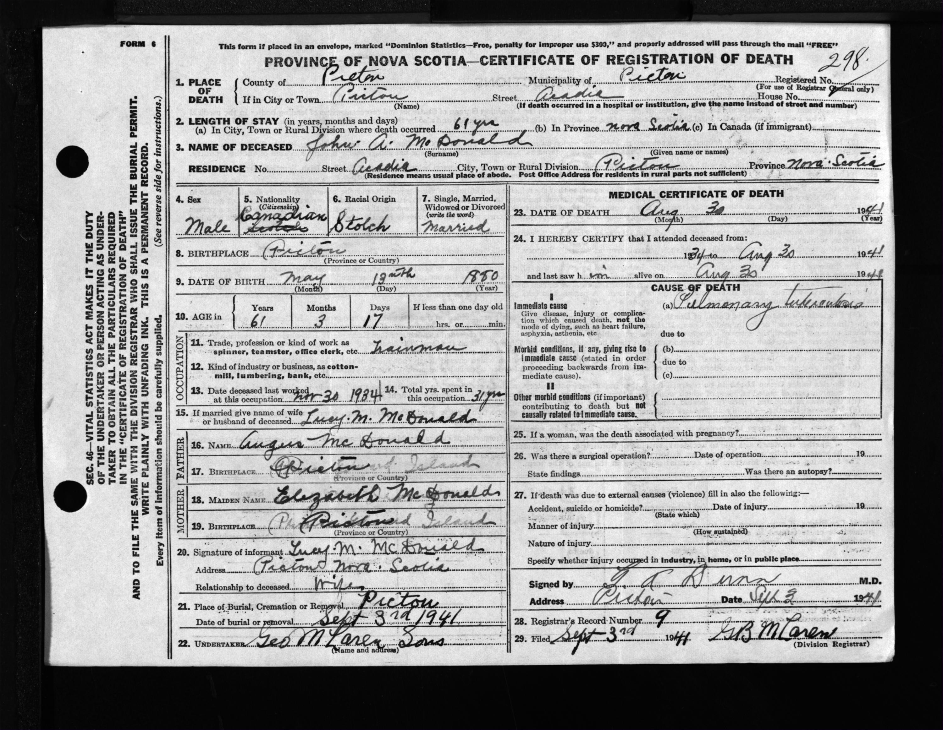 Male Death Registration: Year: 1941 file: 200 number: 298