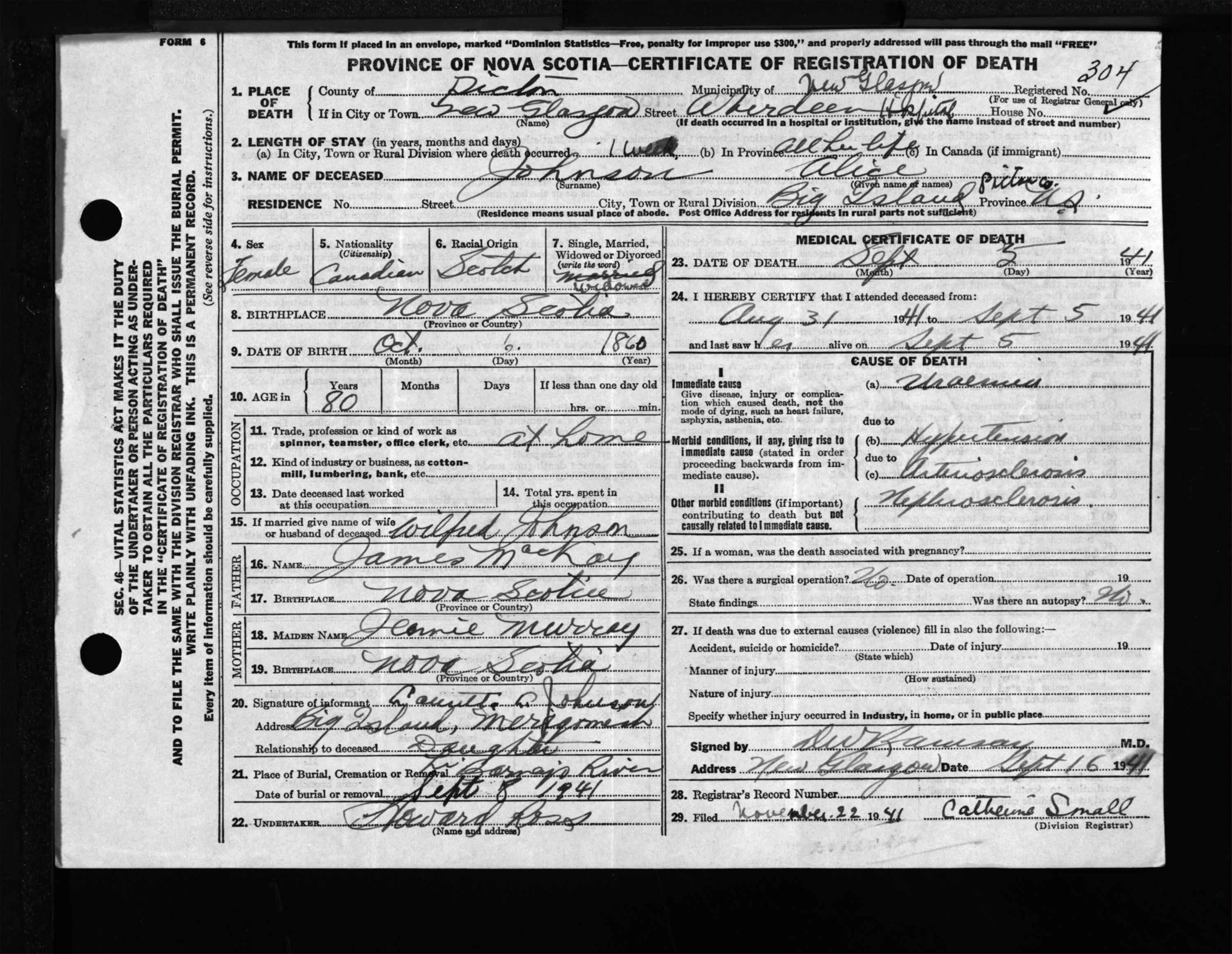 Female Death Registration: Year: 1941 file: 200 number: 304