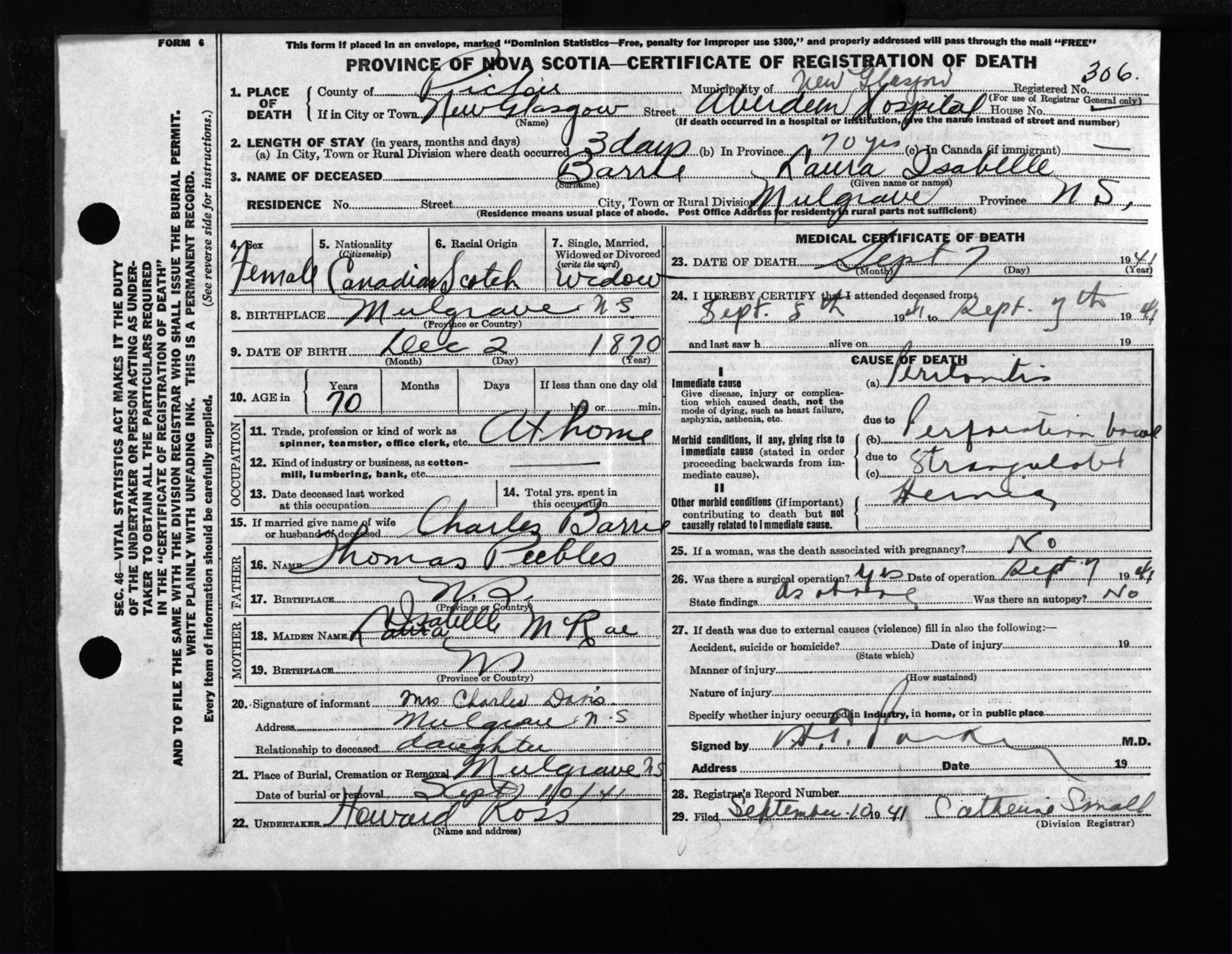 Female Death Registration: Year: 1941 file: 200 number: 306