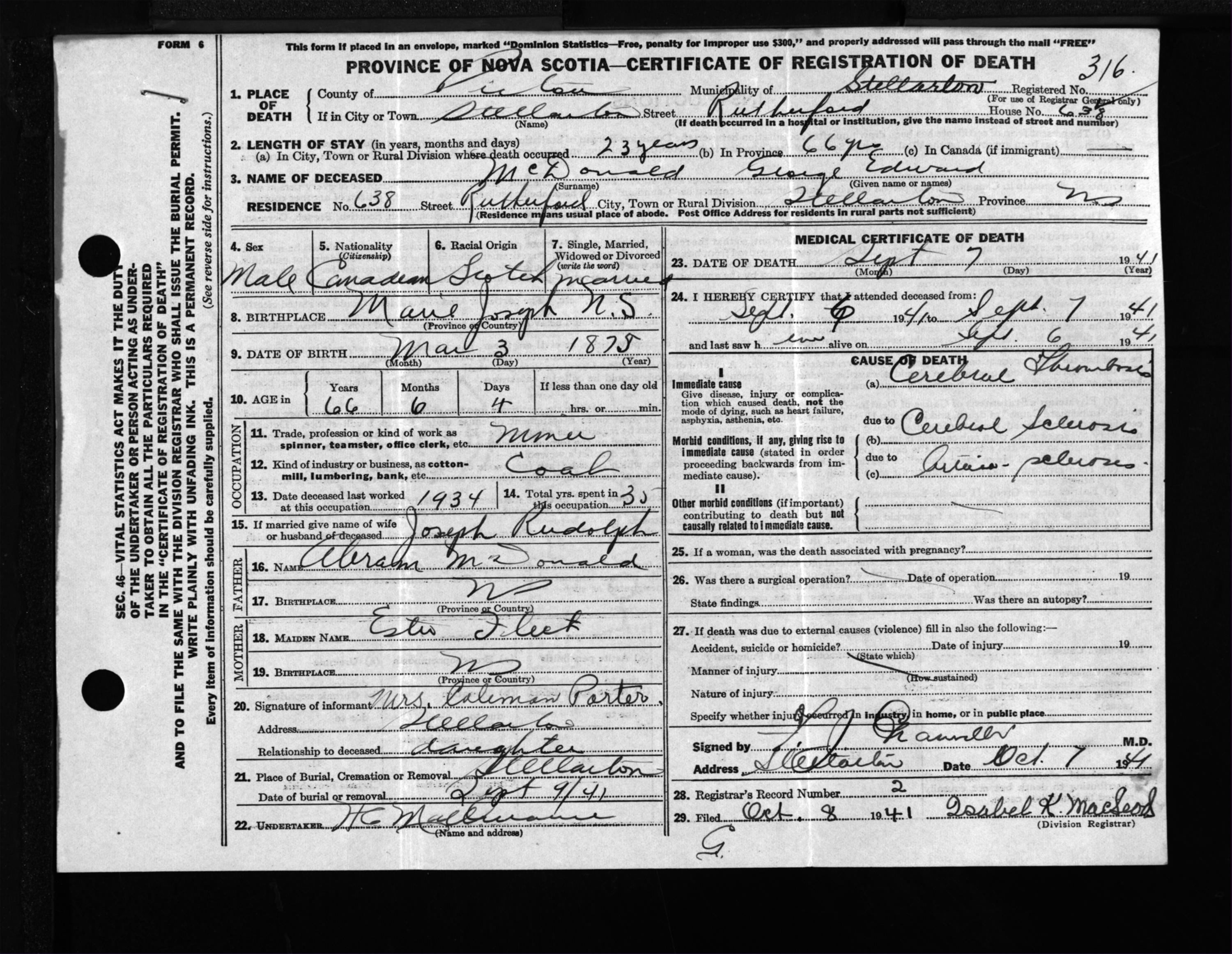 Male Death Registration: Year: 1941 file: 200 number: 316