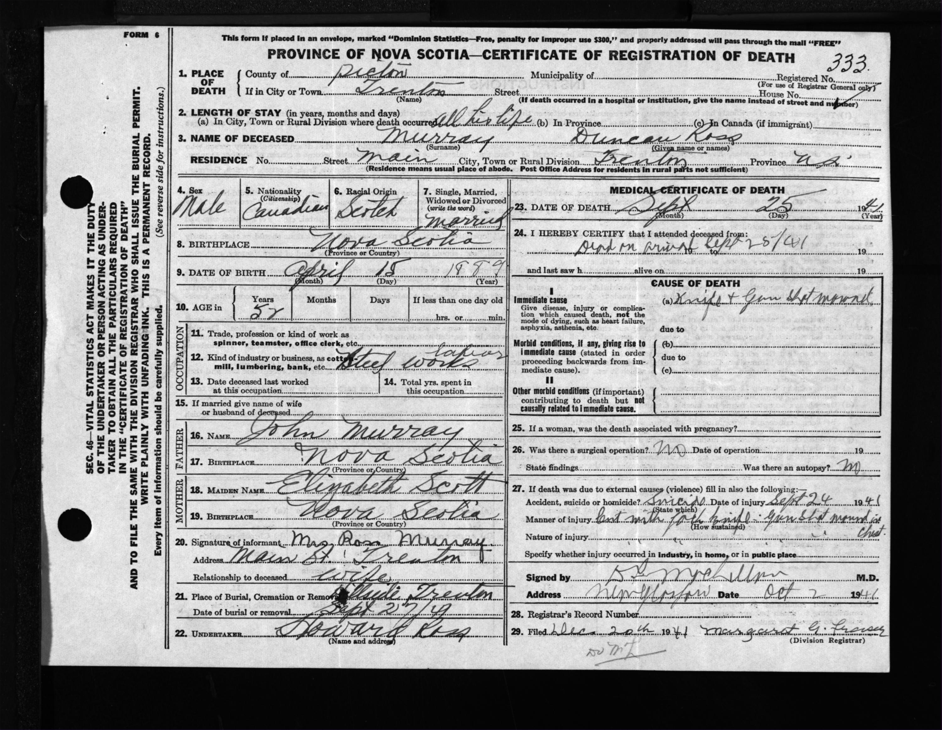 Male Death Registration: Year: 1941 file: 200 number: 333