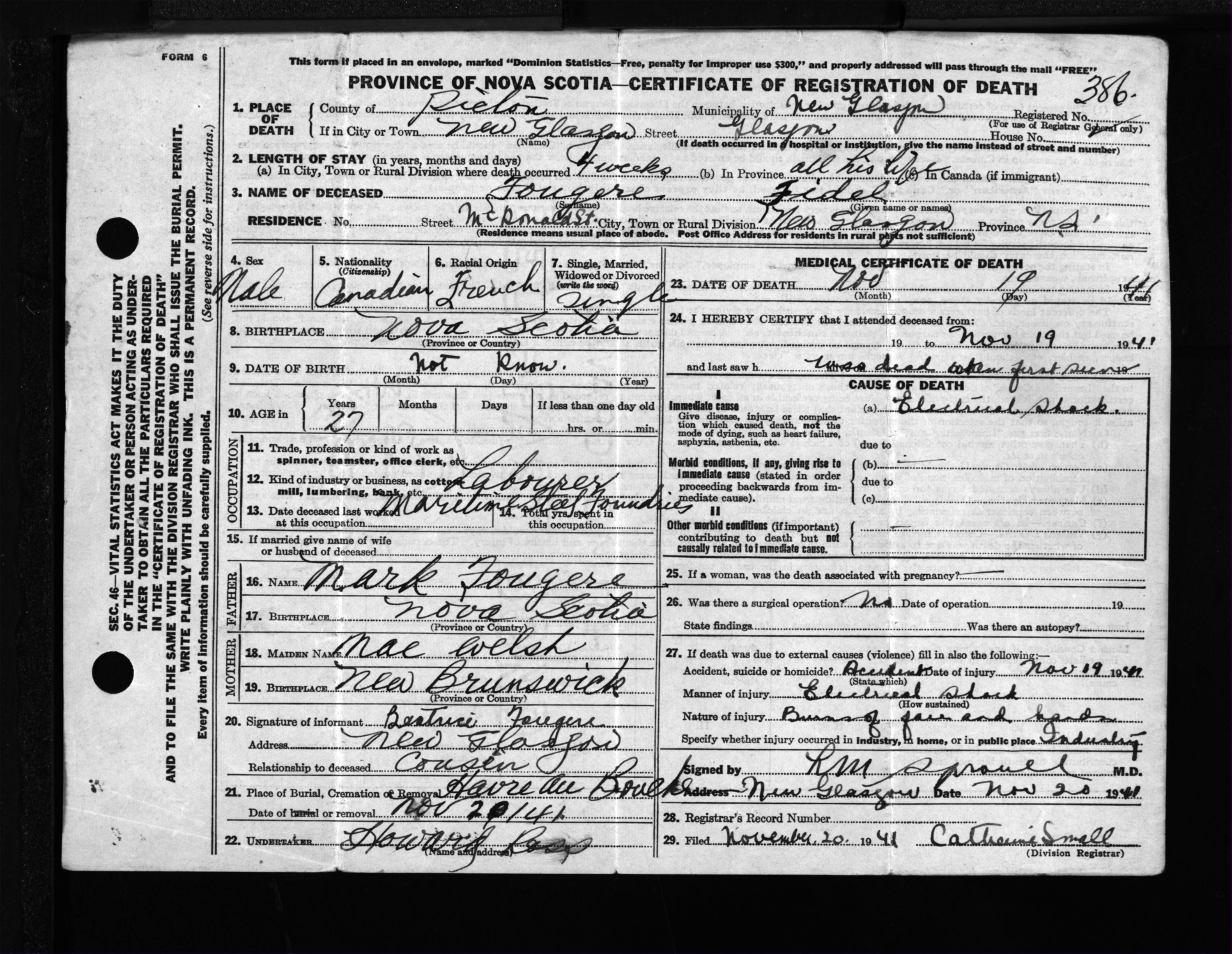 Male Death Registration: Year: 1941 file: 200 number: 386