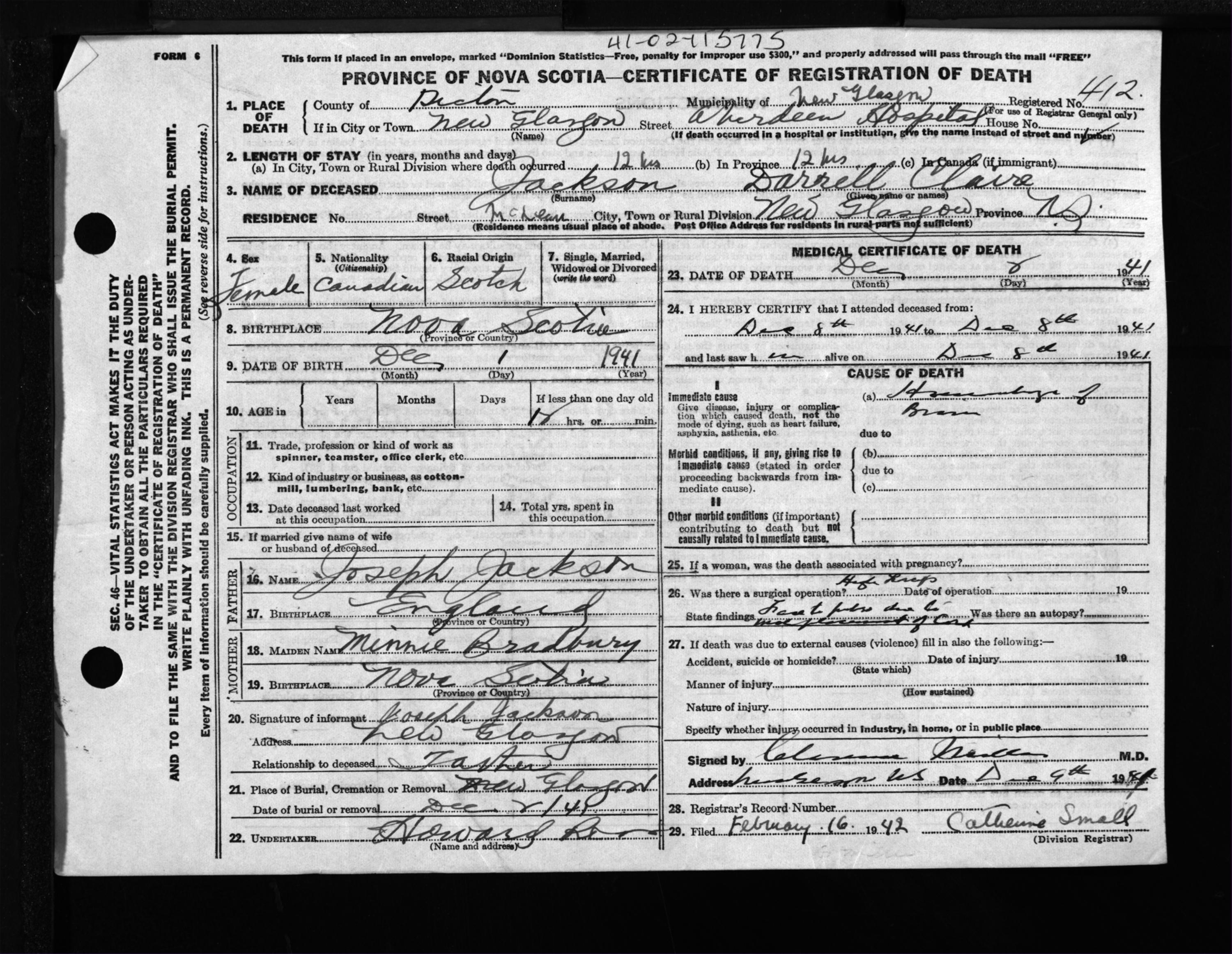 Female Death Registration: Year: 1941 file: 200 number: 412