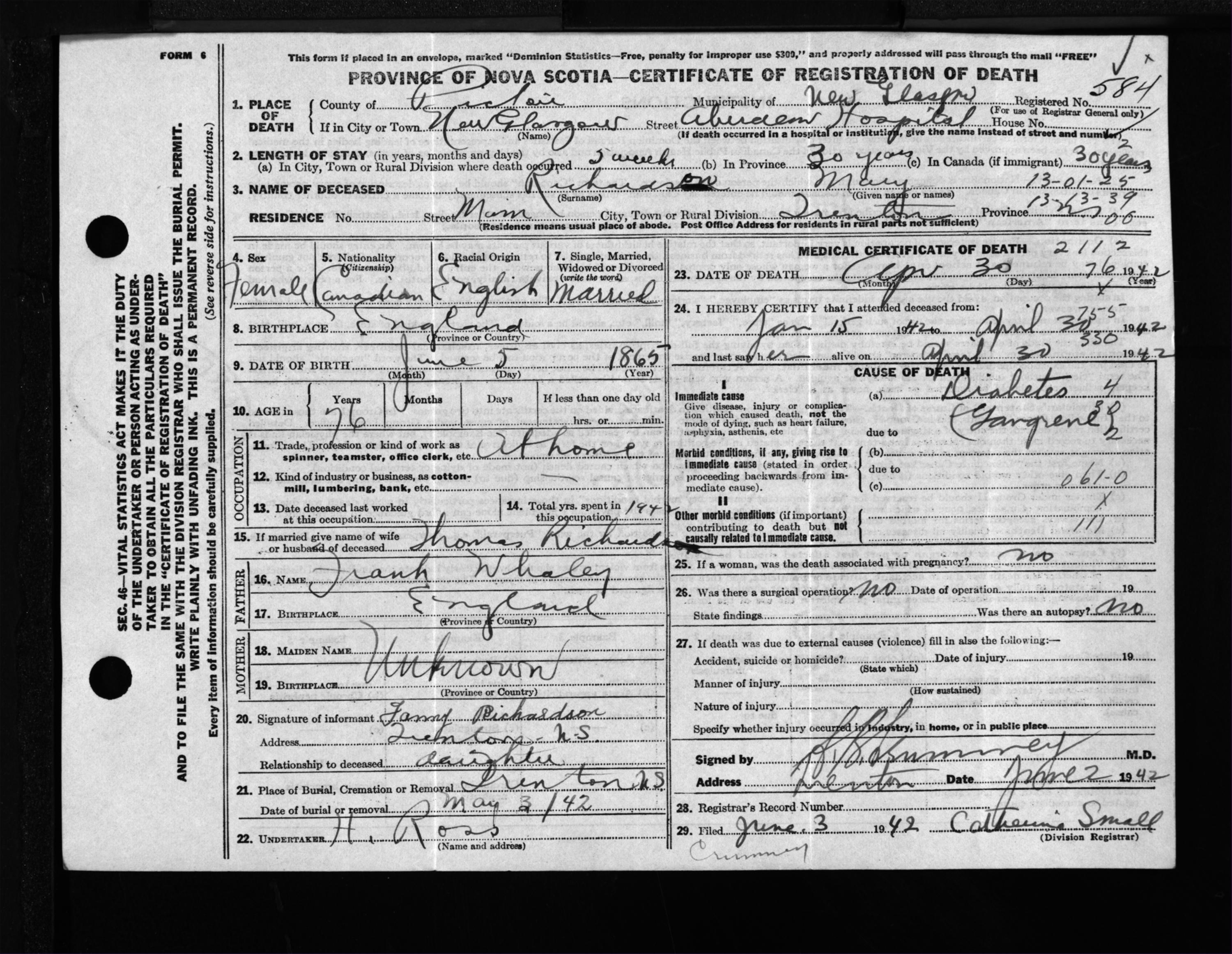 Female Death Registration: Year: 1942 file: 200 number: 584