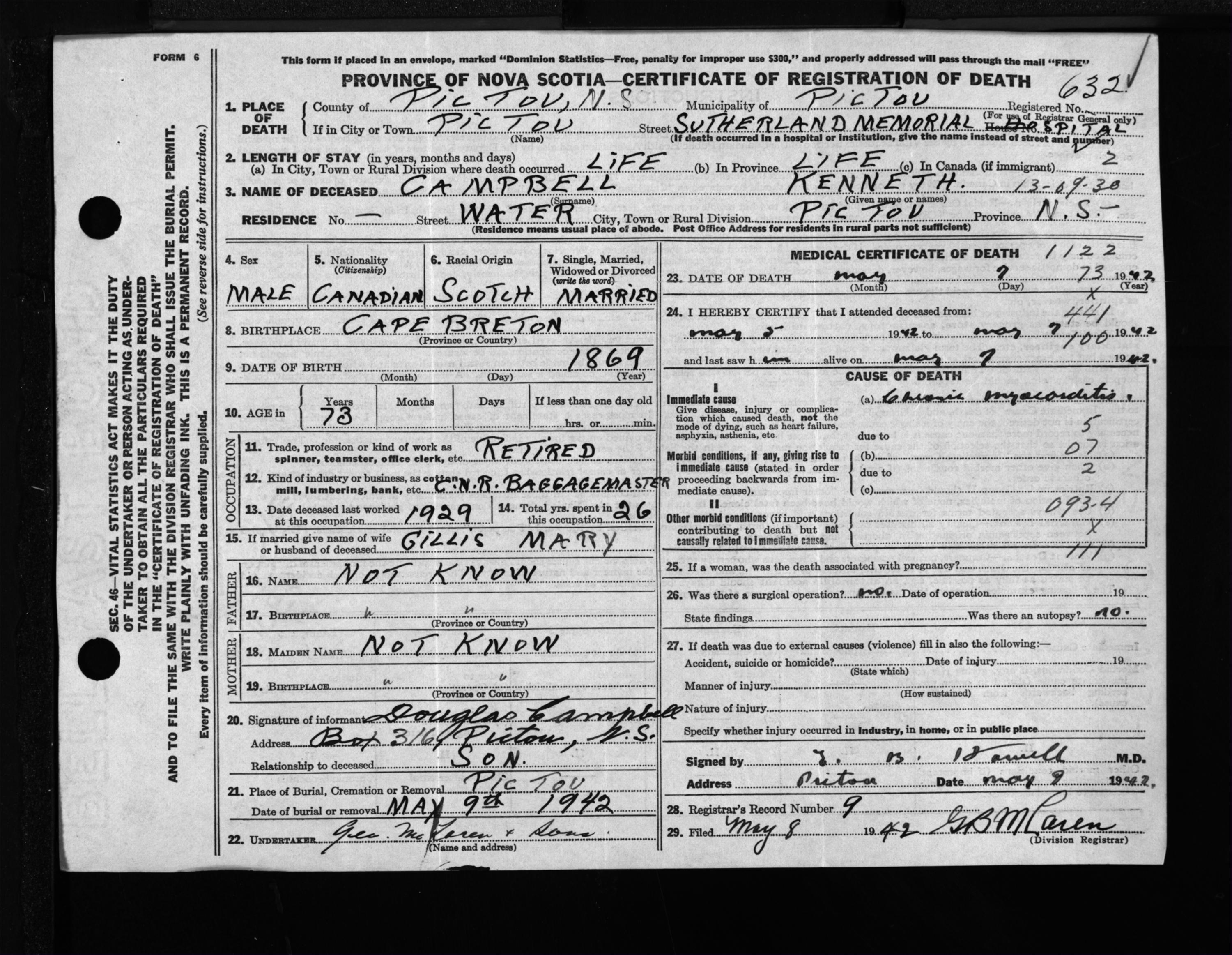 Male Death Registration: Year: 1942 file: 200 number: 632