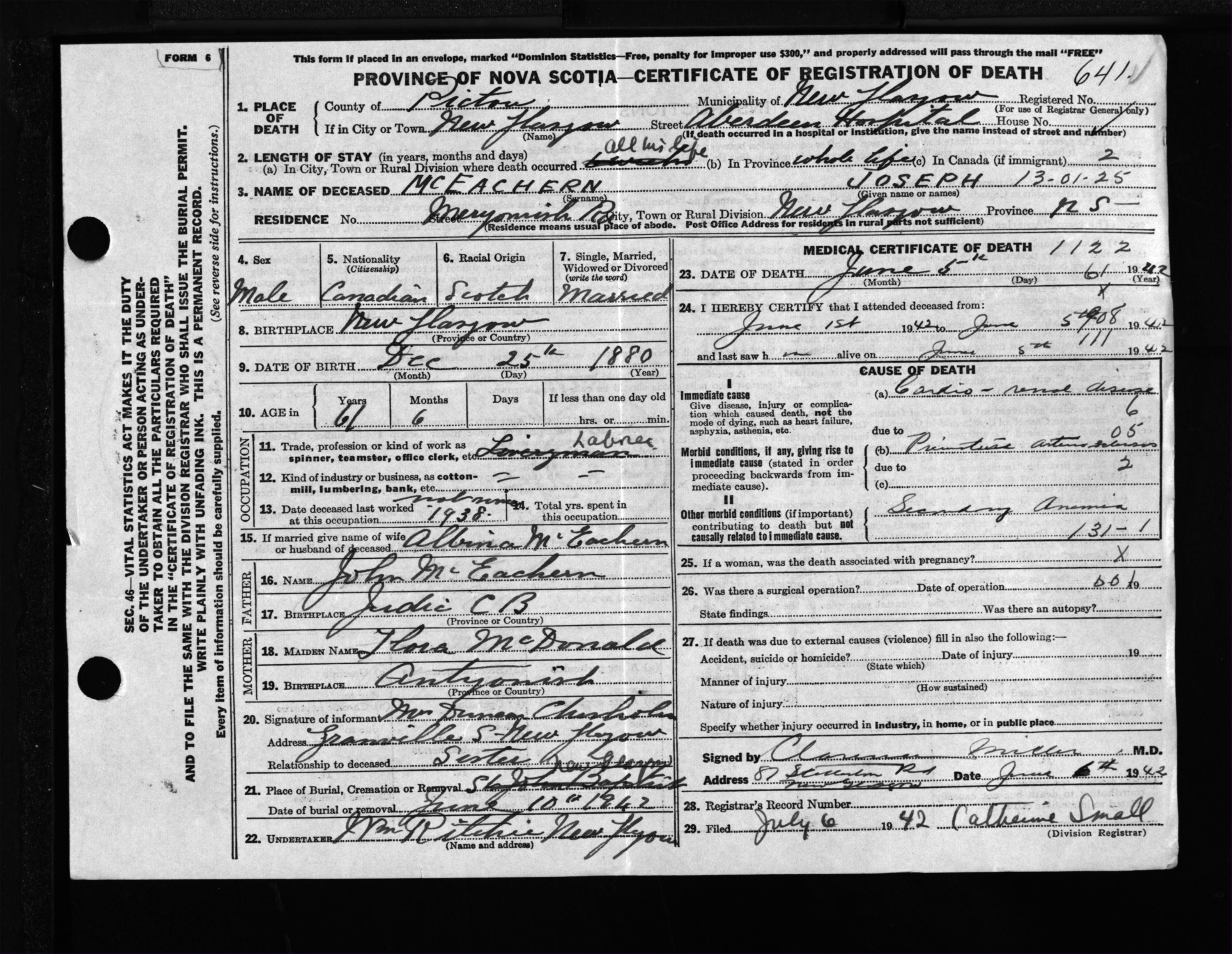 Male Death Registration: Year: 1942 file: 200 number: 641