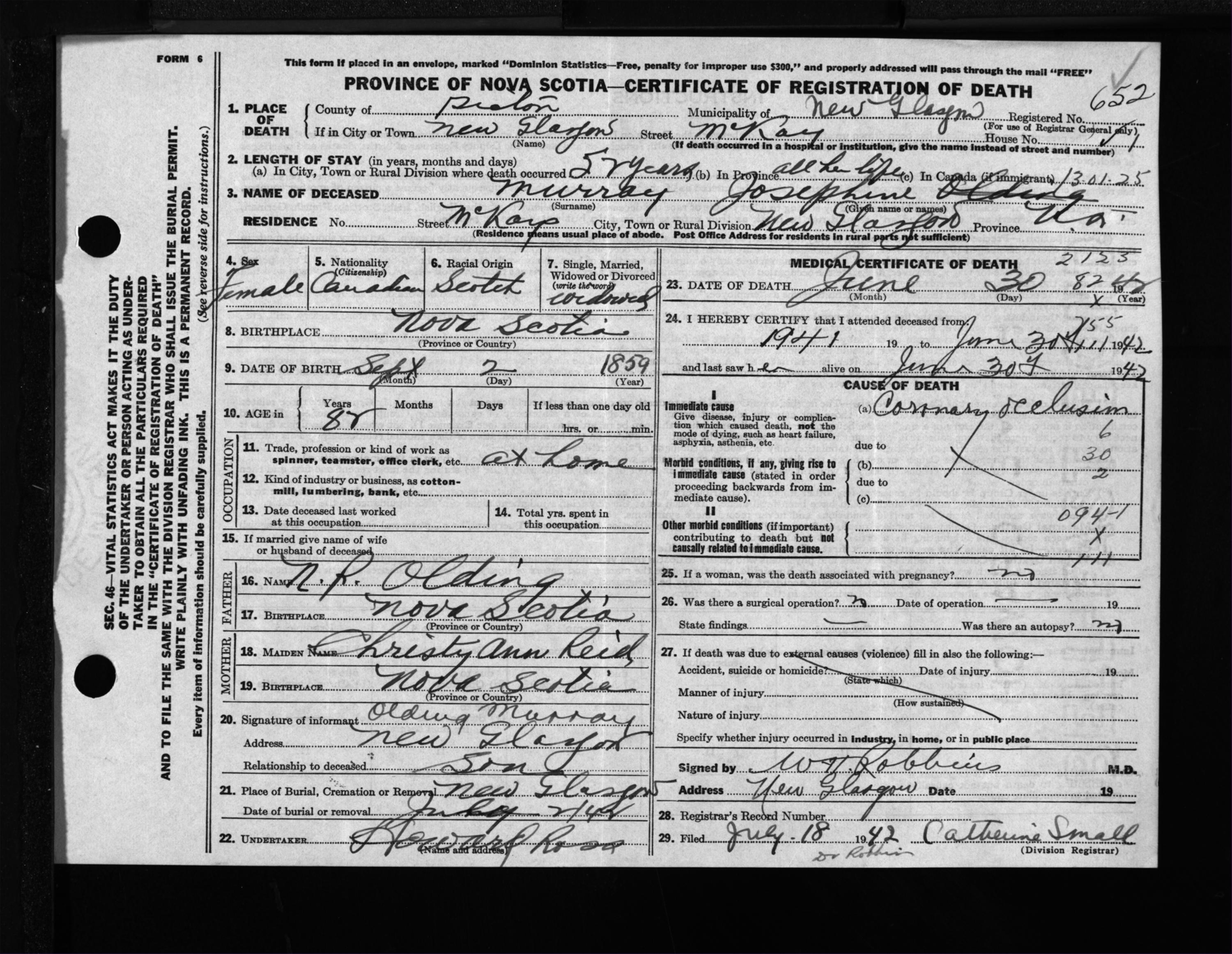 Female Death Registration: Year: 1942 file: 200 number: 652