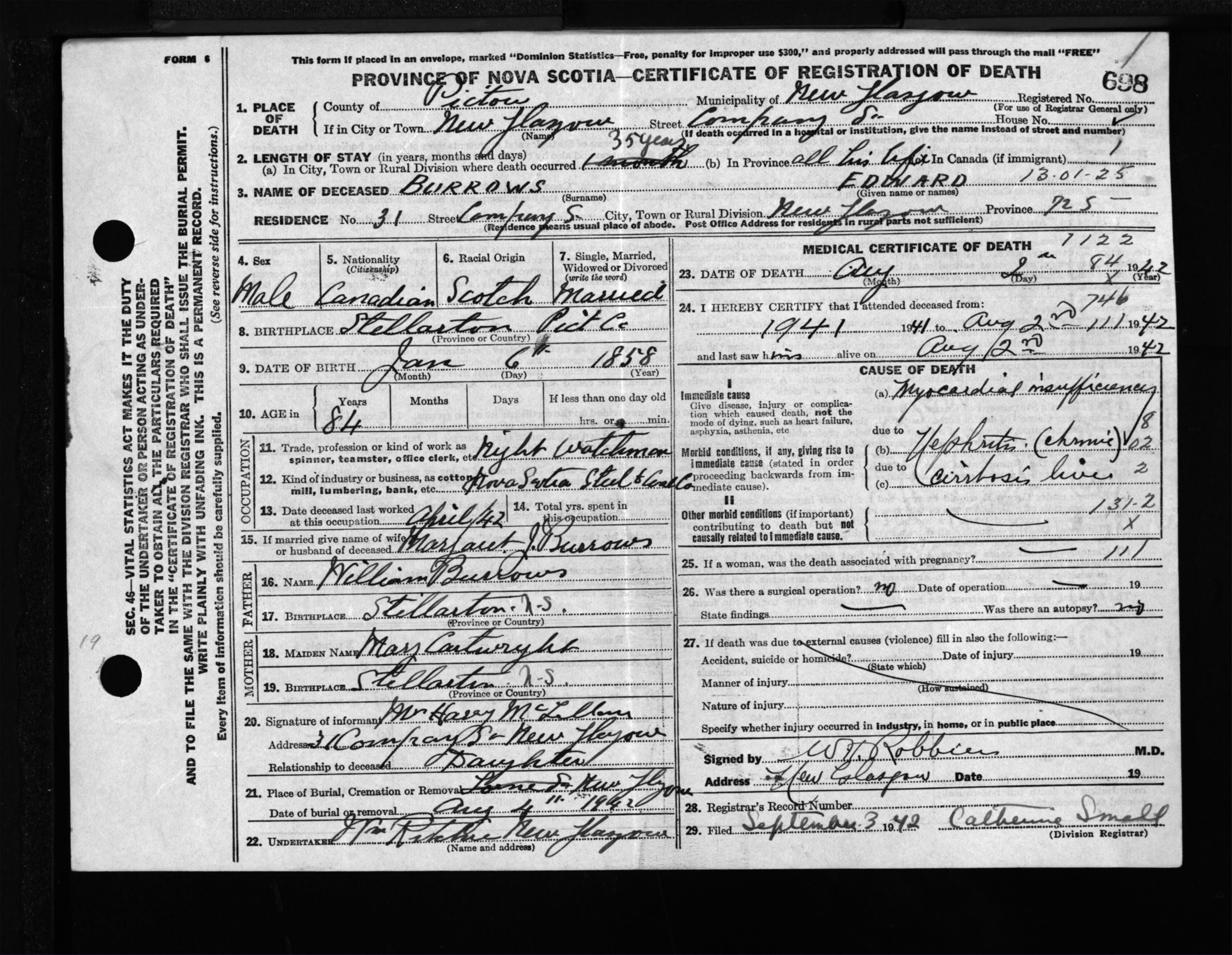 Male Death Registration: Year: 1942 file: 200 number: 698
