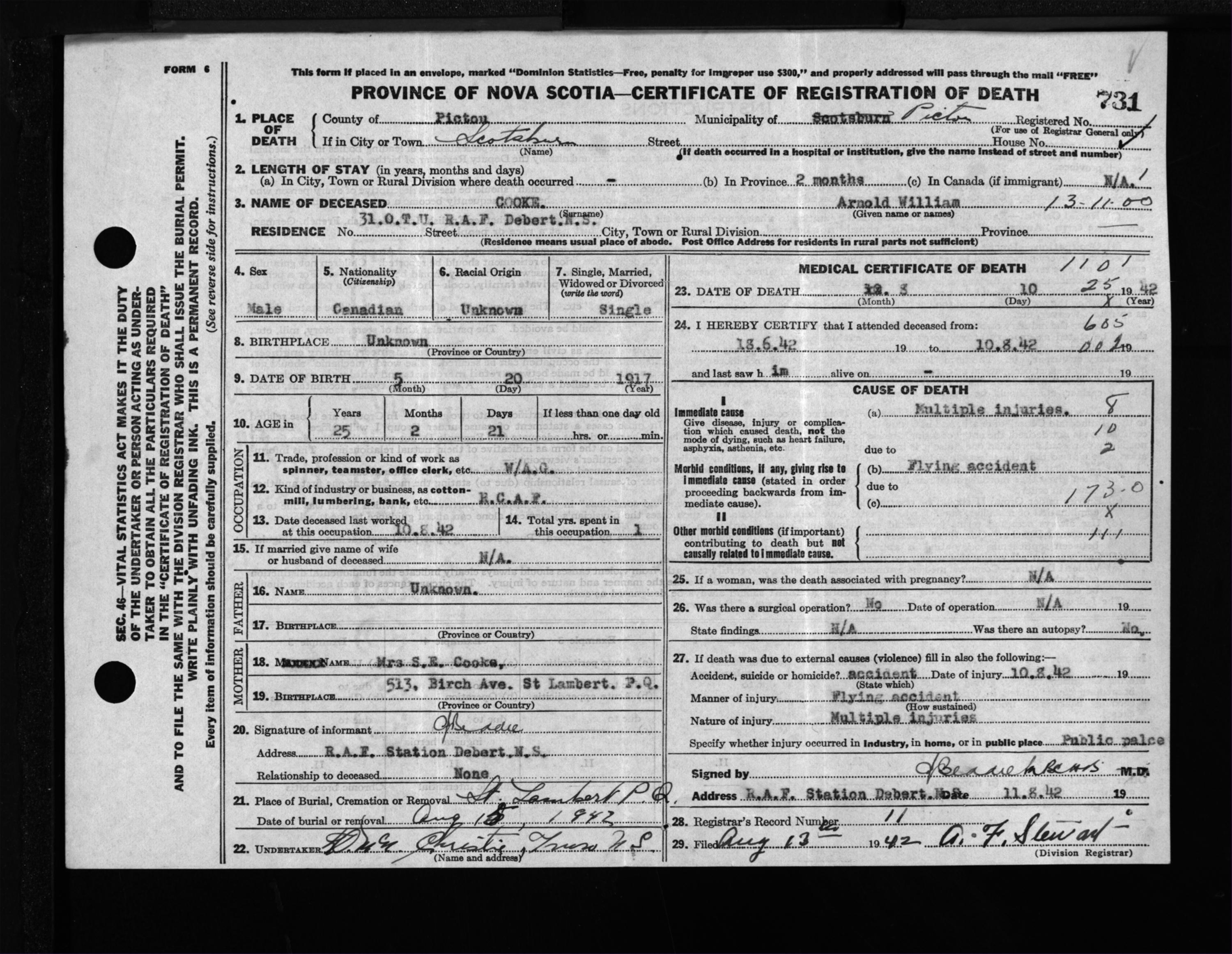 Male Death Registration: Year: 1942 file: 200 number: 731