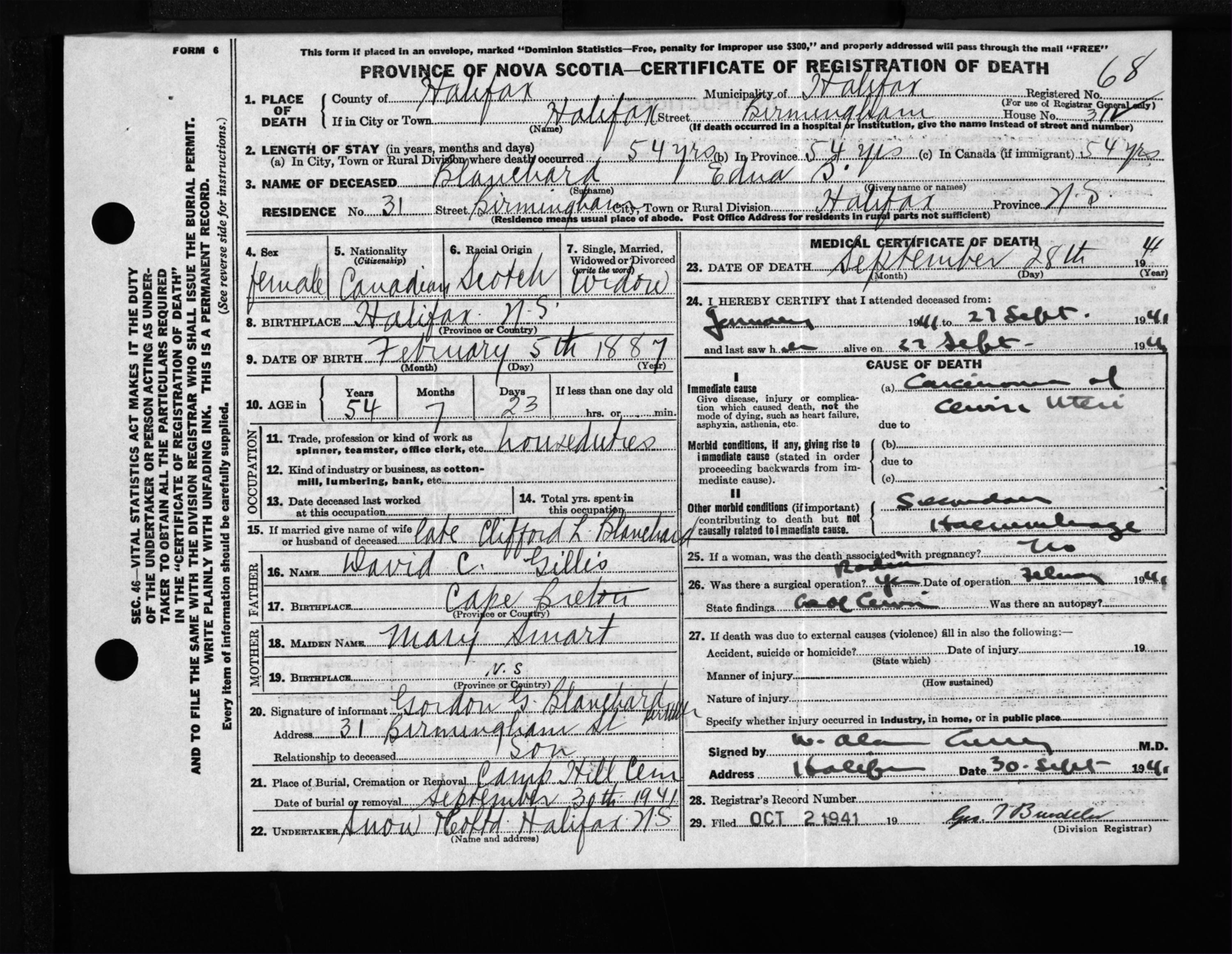 Female Death Registration: Year: 1941 file: 201 number: 68