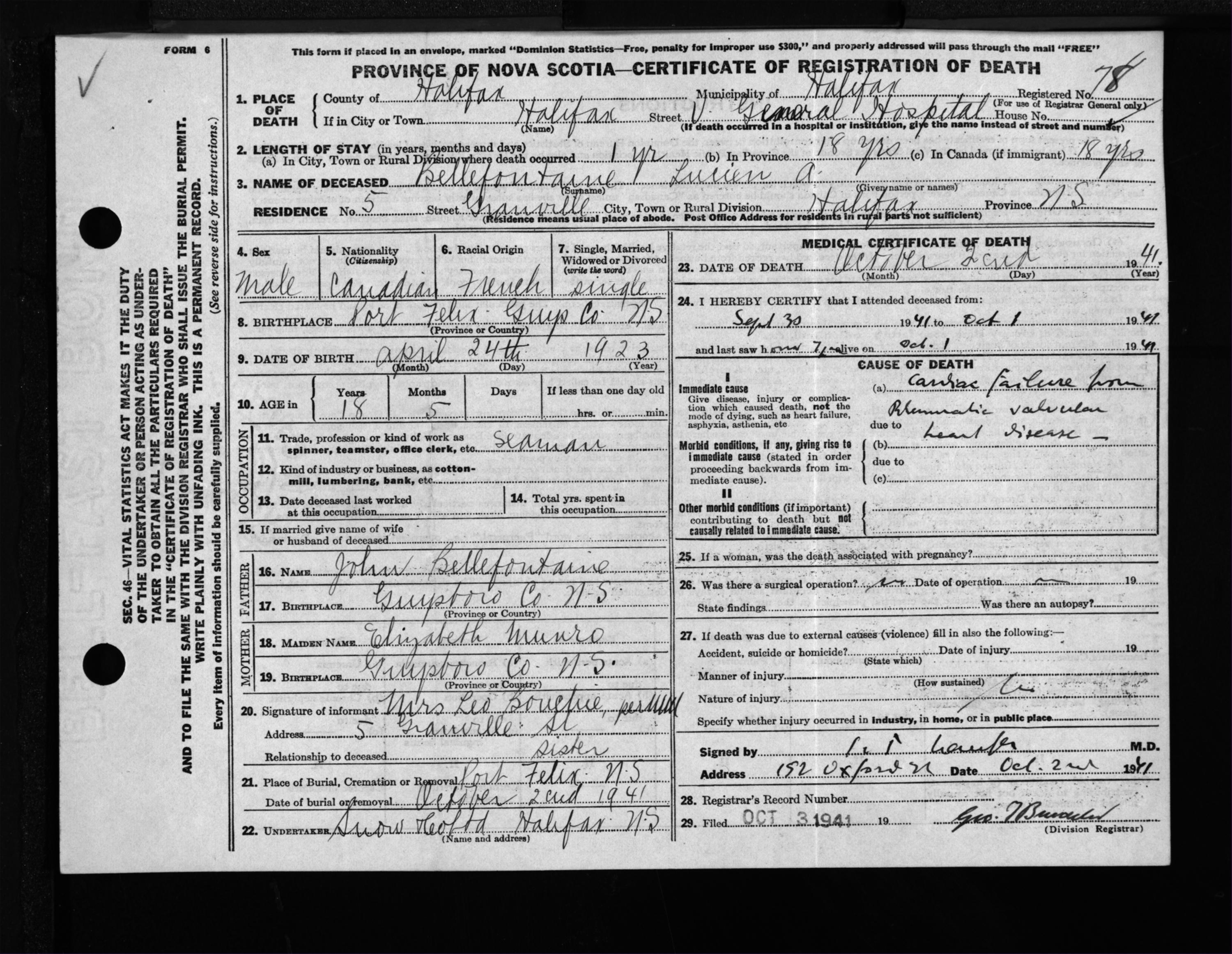 Male Death Registration: Year: 1941 file: 201 number: 78