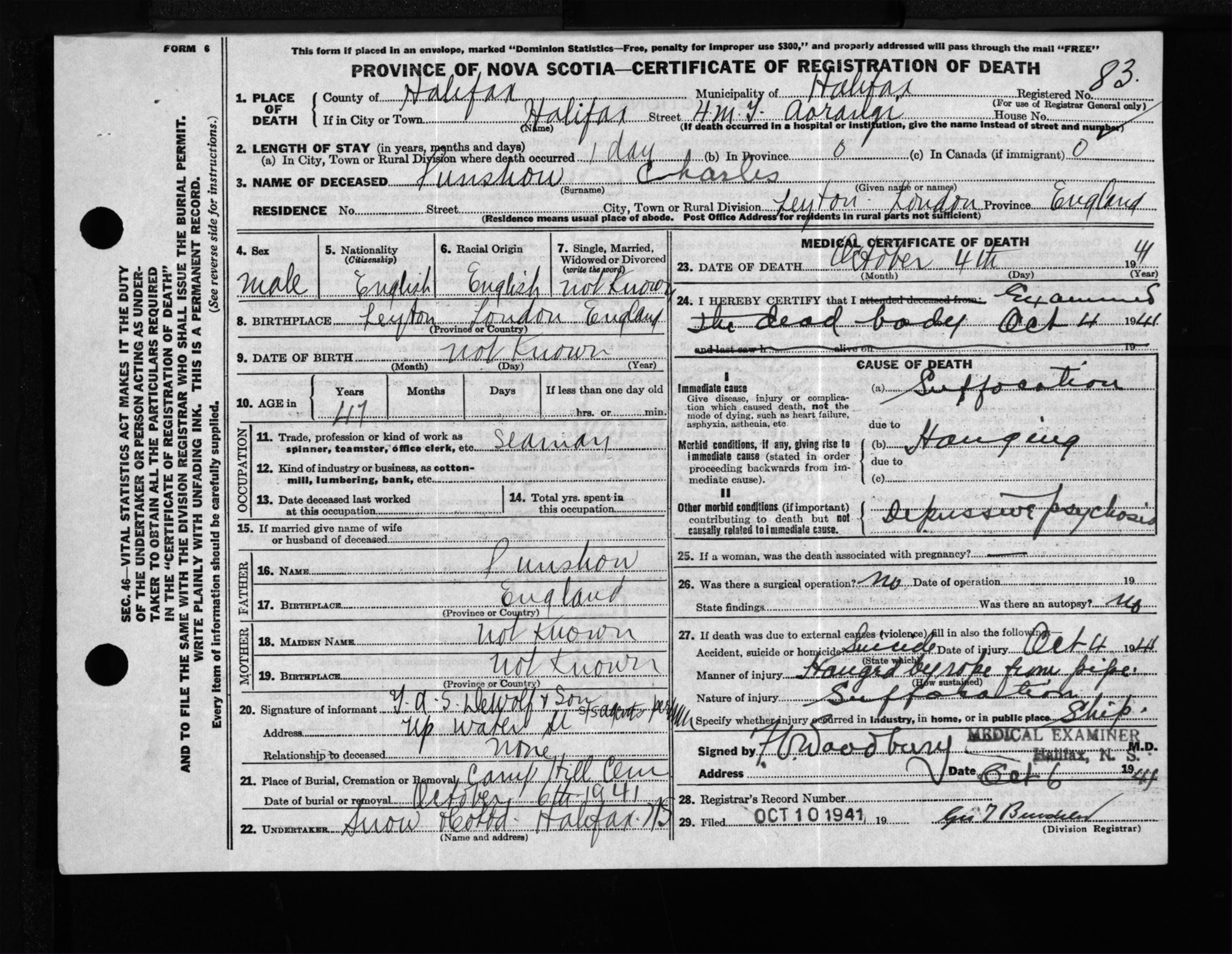 Male Death Registration: Year: 1941 file: 201 number: 83