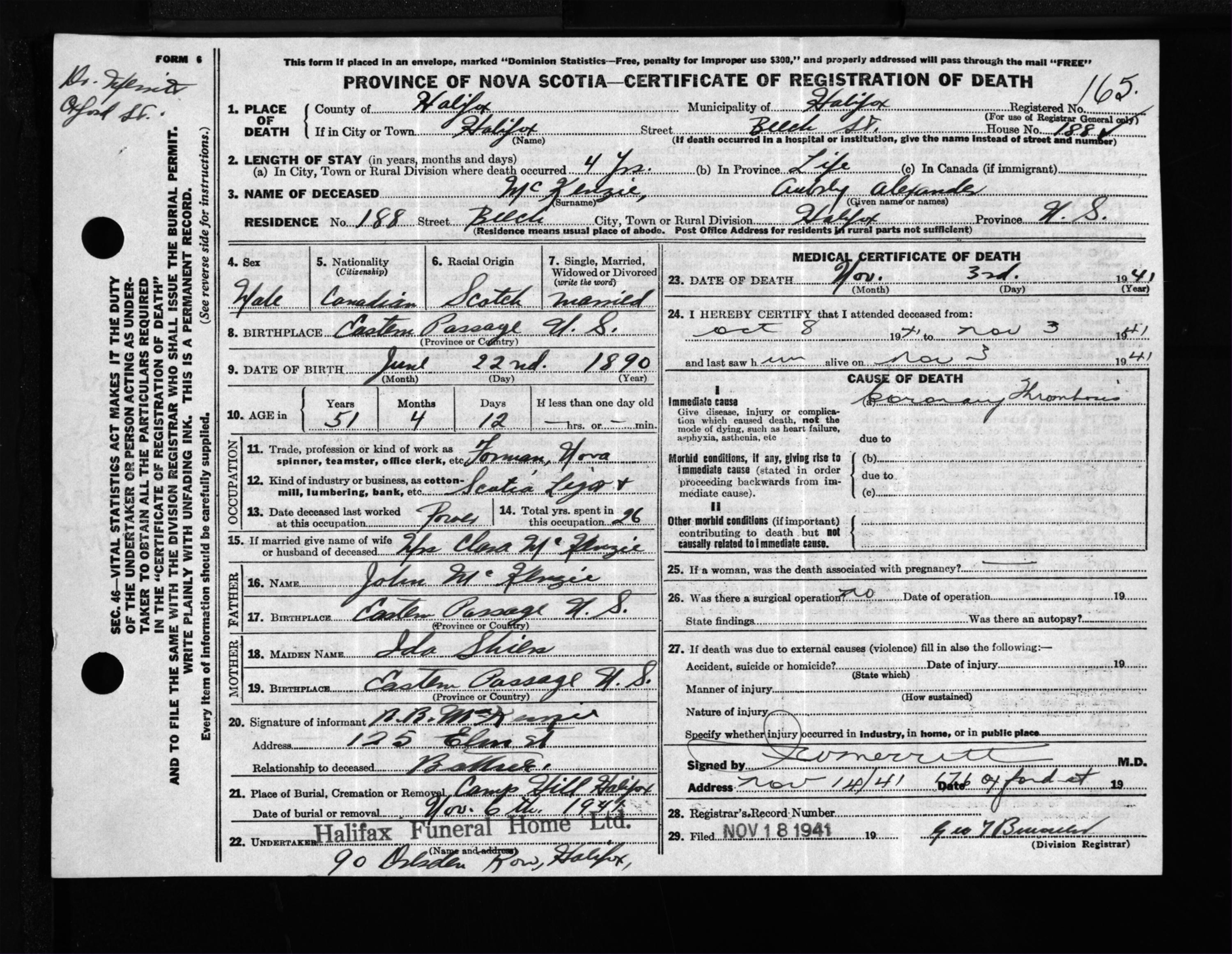Male Death Registration: Year: 1941 file: 201 number: 165