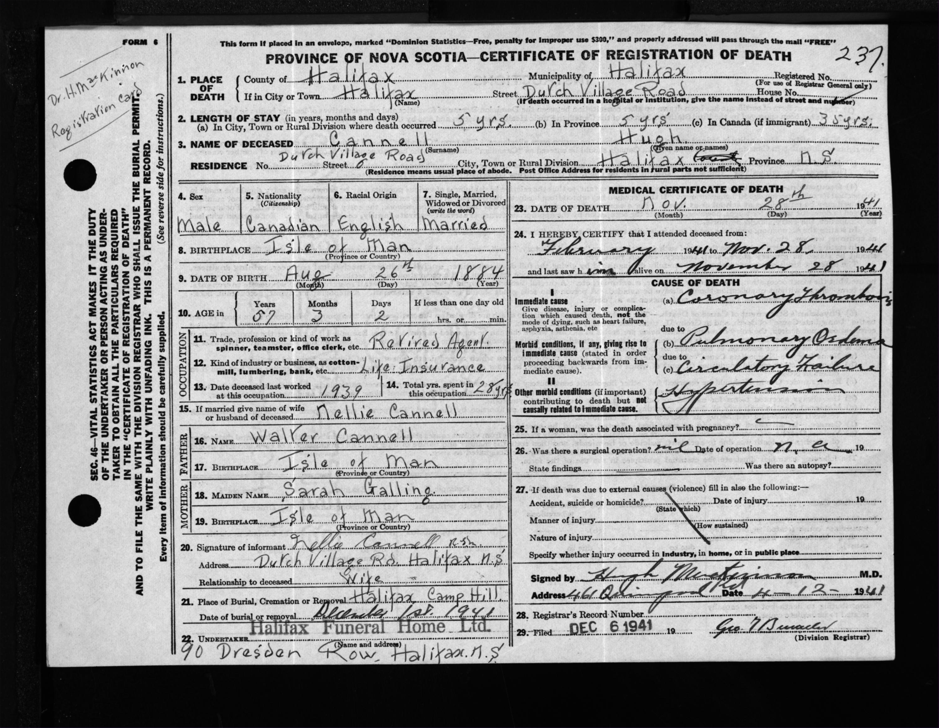 Male Death Registration: Year: 1941 file: 201 number: 237