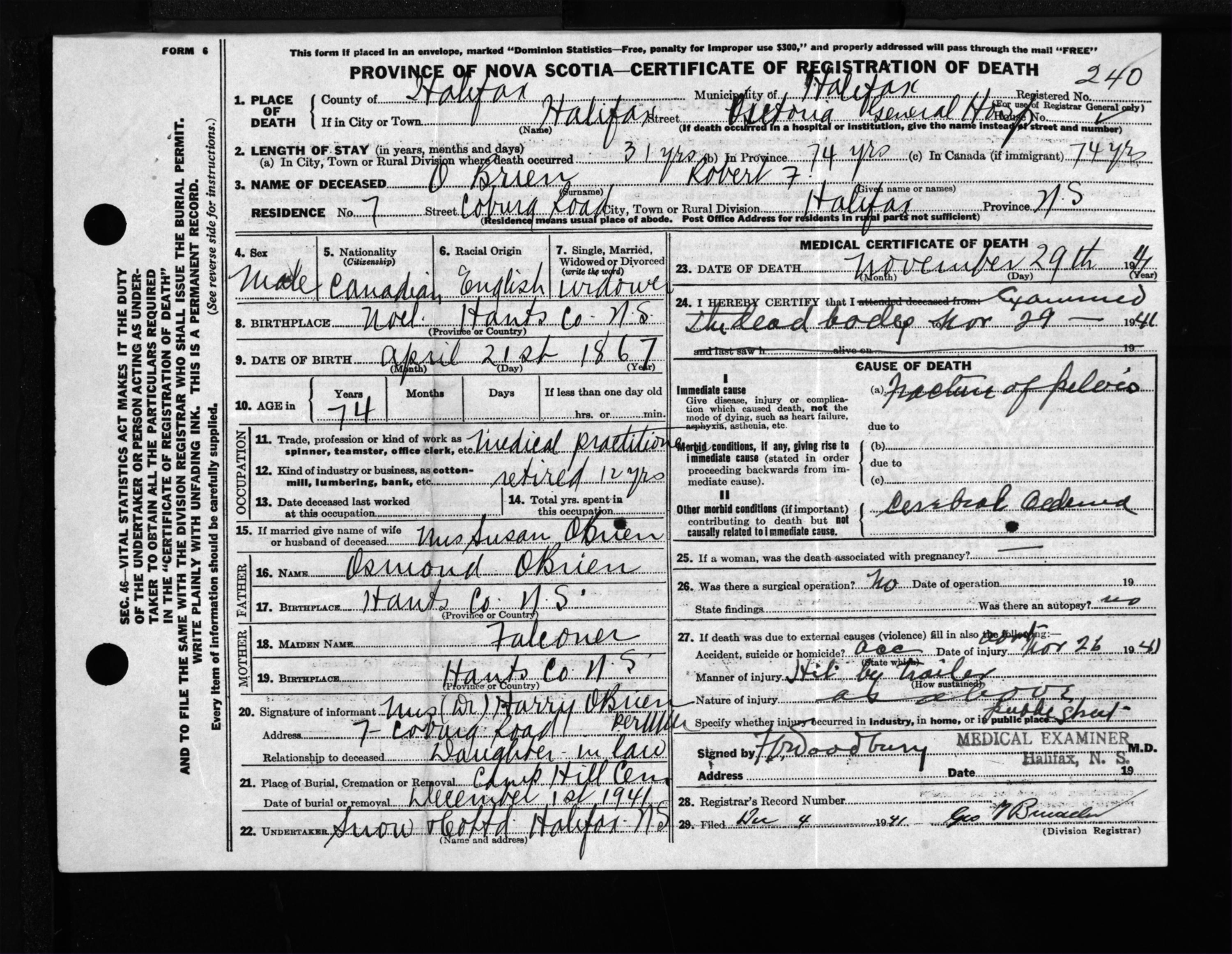 Male Death Registration: Year: 1941 file: 201 number: 240