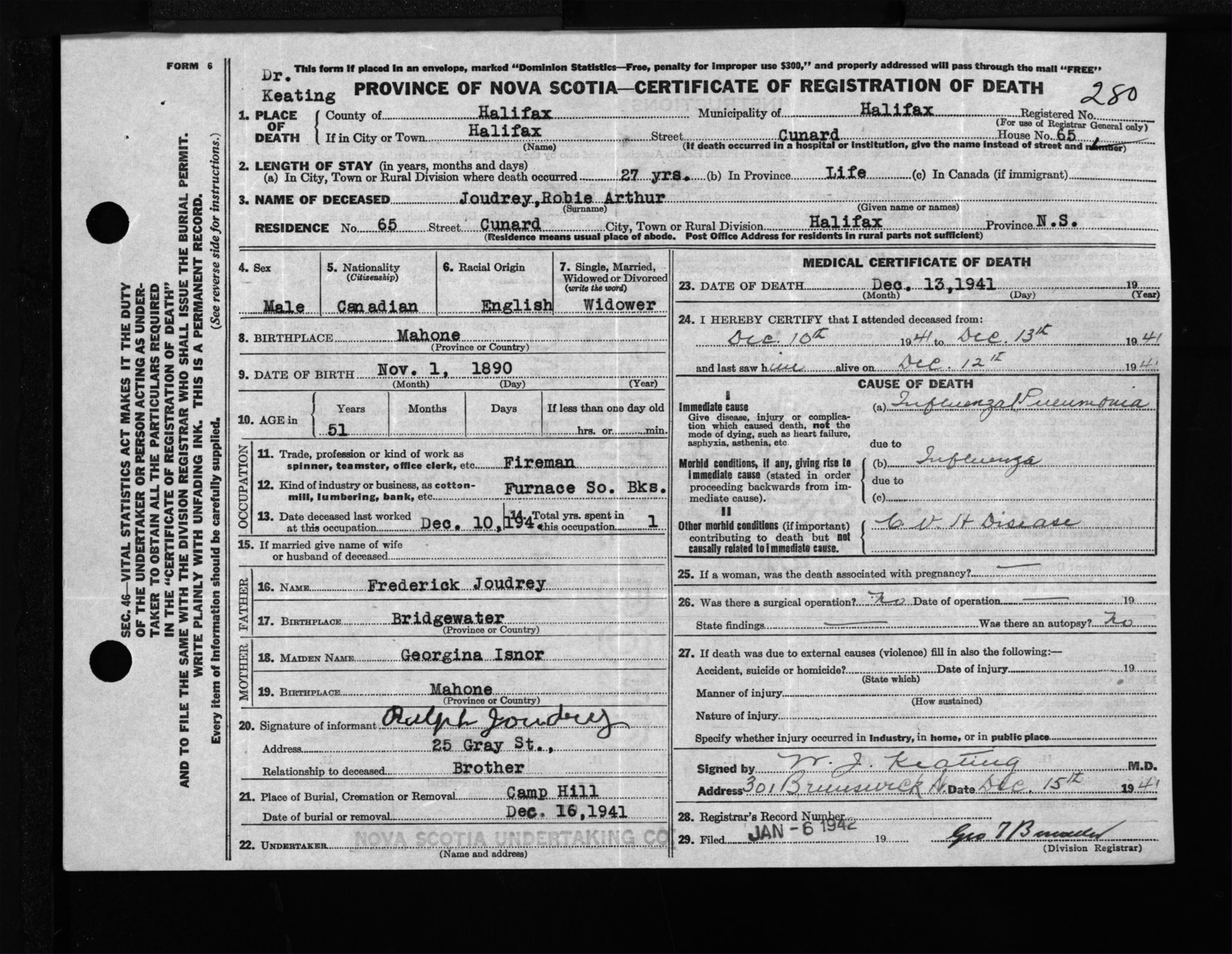 Male Death Registration: Year: 1941 file: 201 number: 280