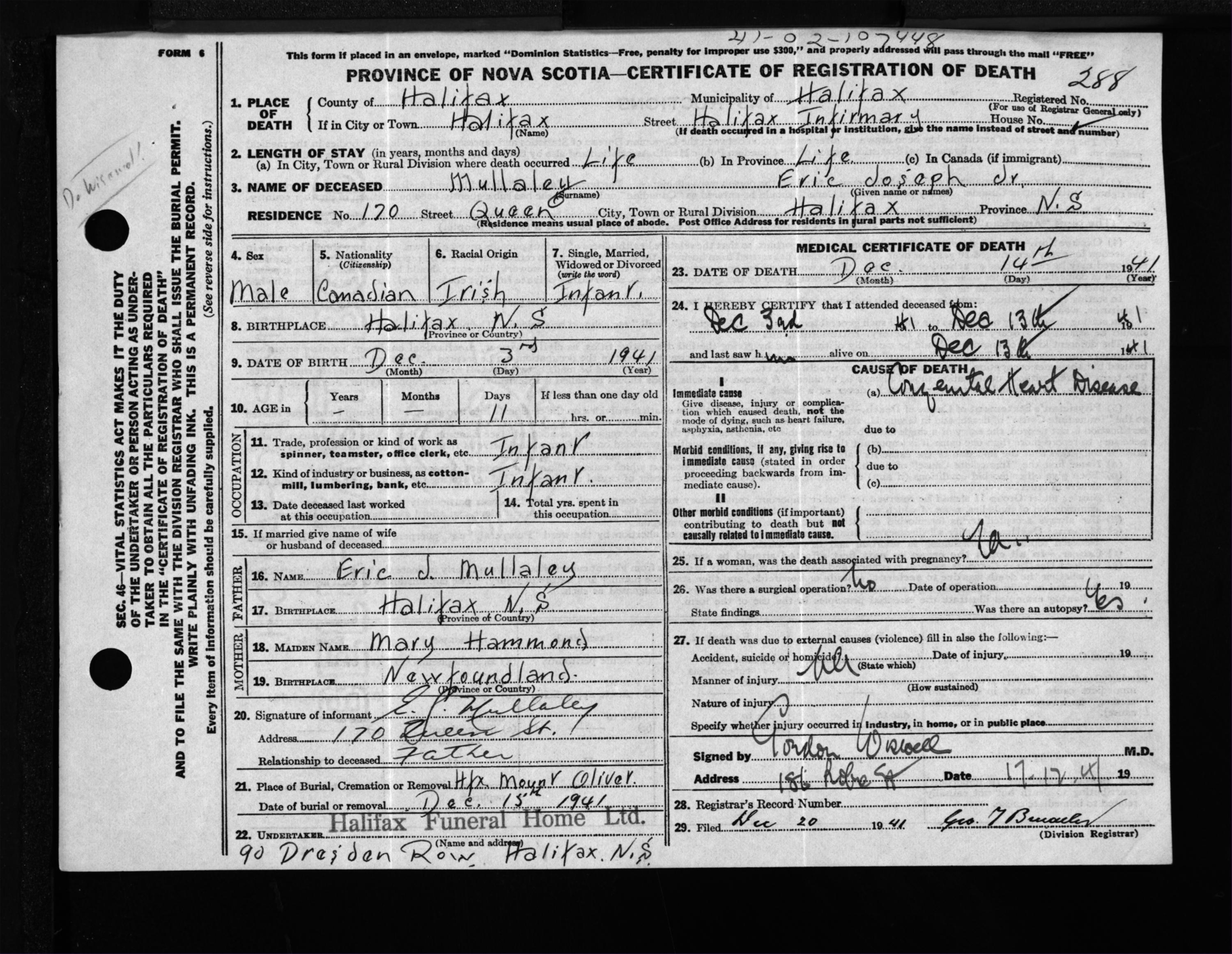Male Death Registration: Year: 1941 file: 201 number: 288