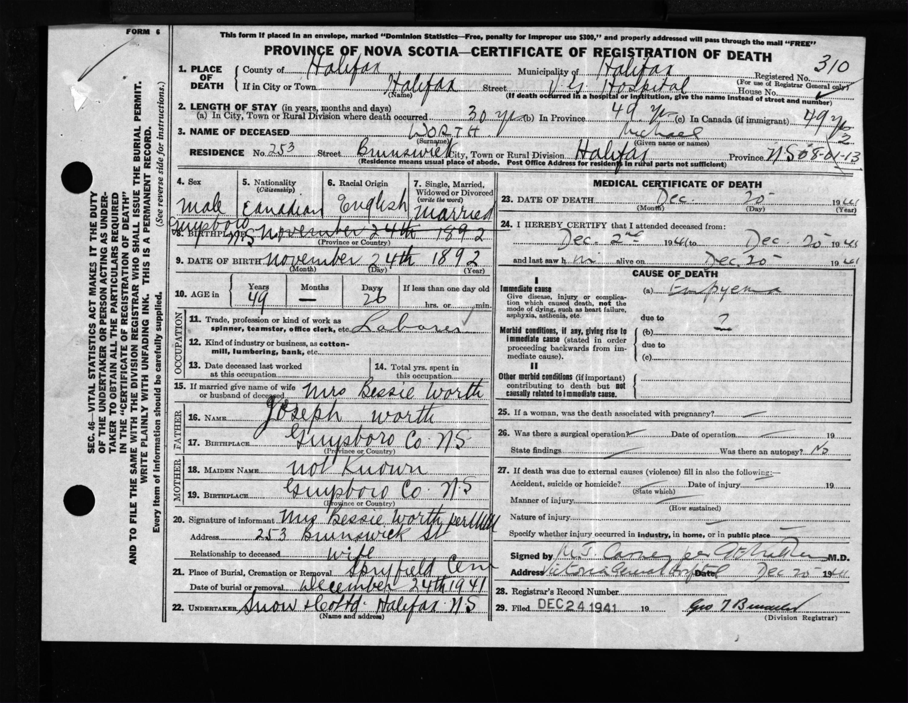 Male Death Registration: Year: 1941 file: 201 number: 310