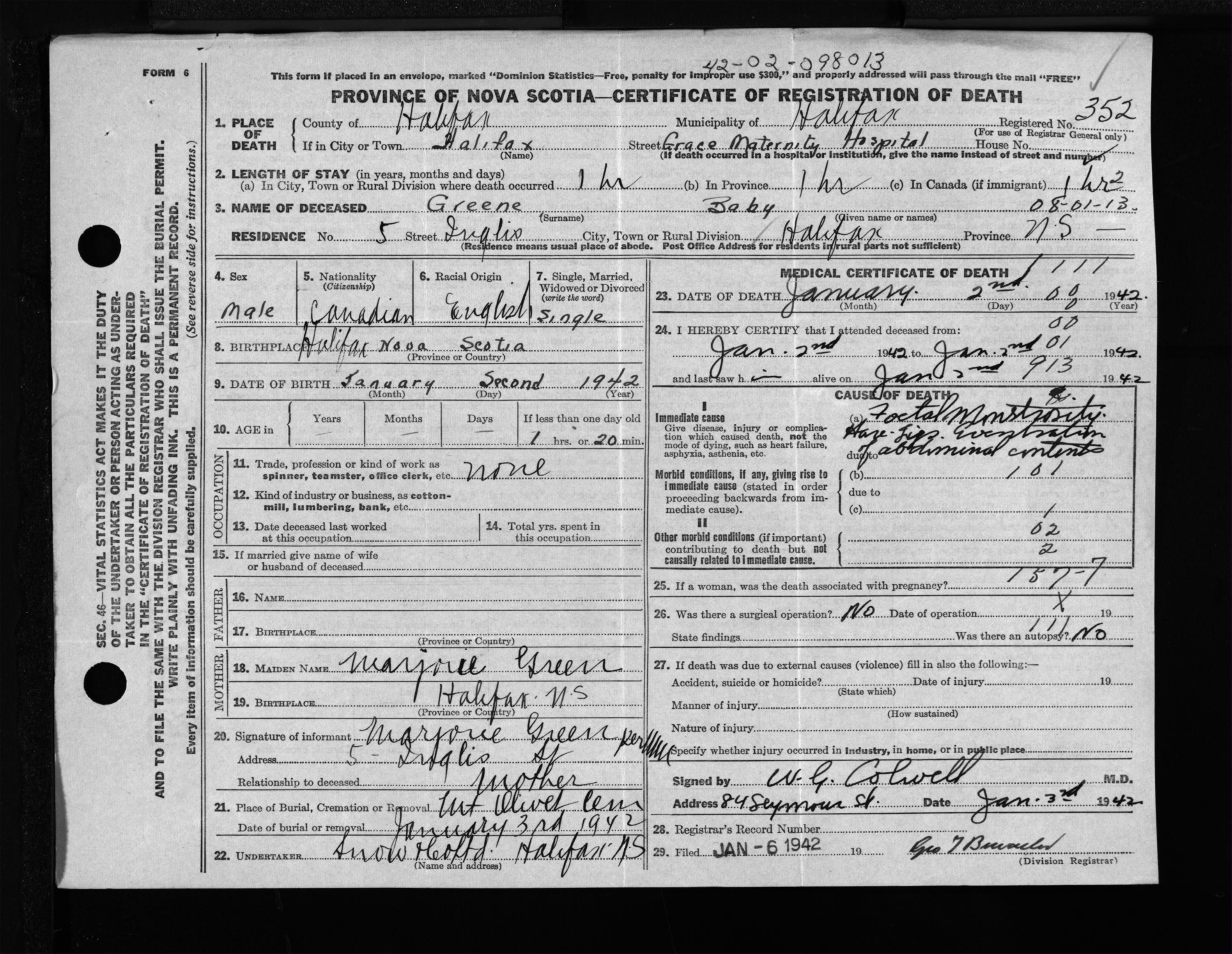 Male Death Registration: Year: 1942 file: 201 number: 352
